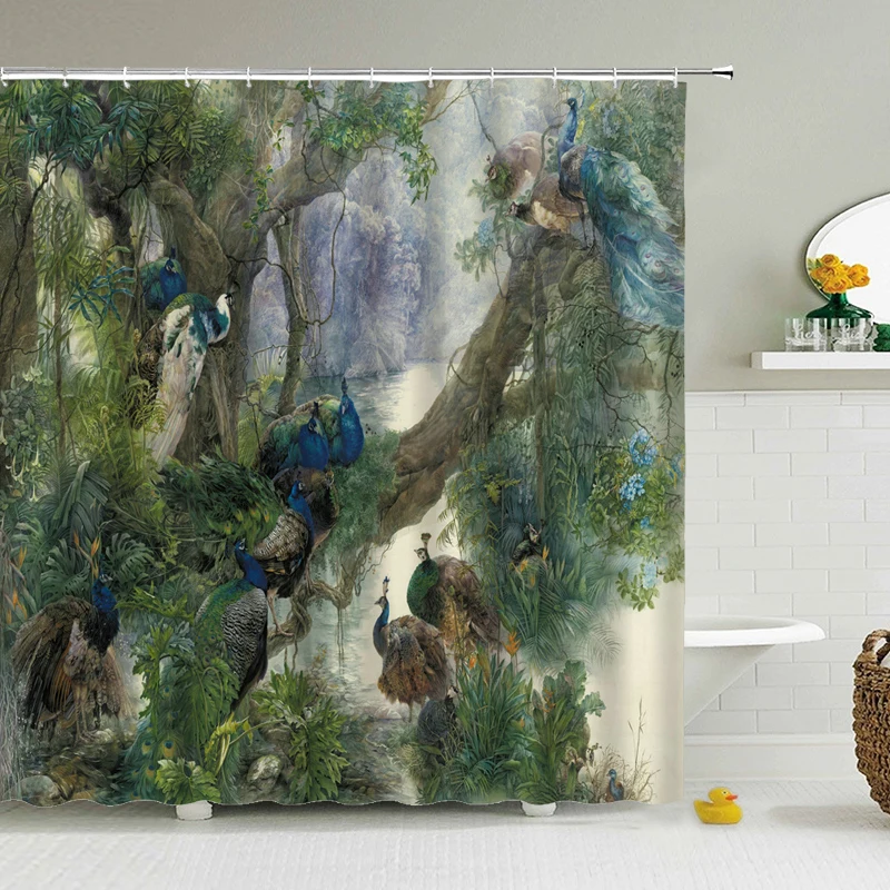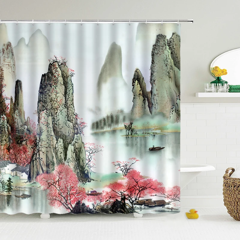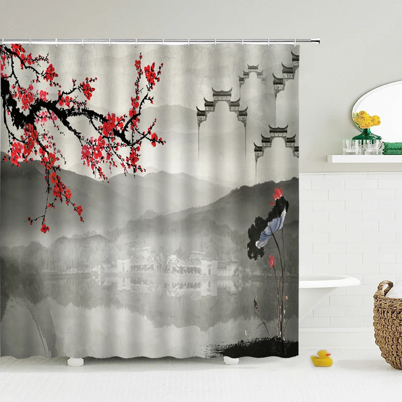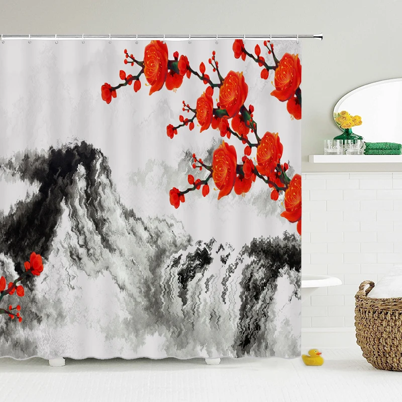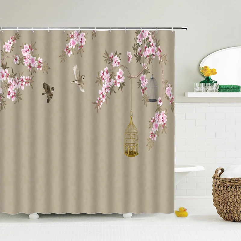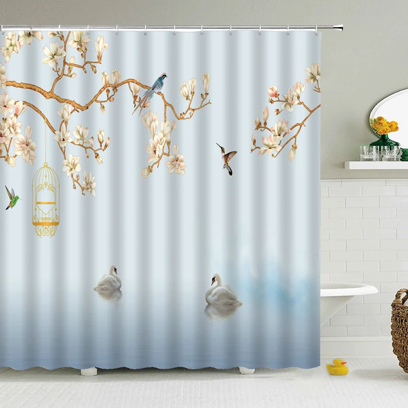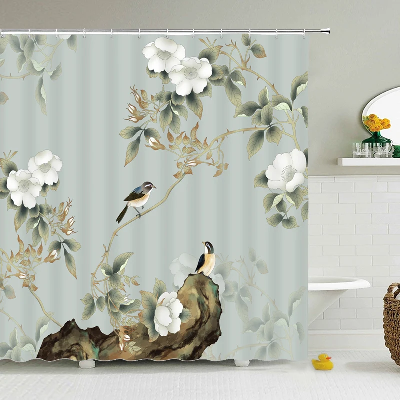 Шторка для душа в китайском стиле, водонепроницаемая занавеска для ванной из полиэстера с рисунком птиц и цветов