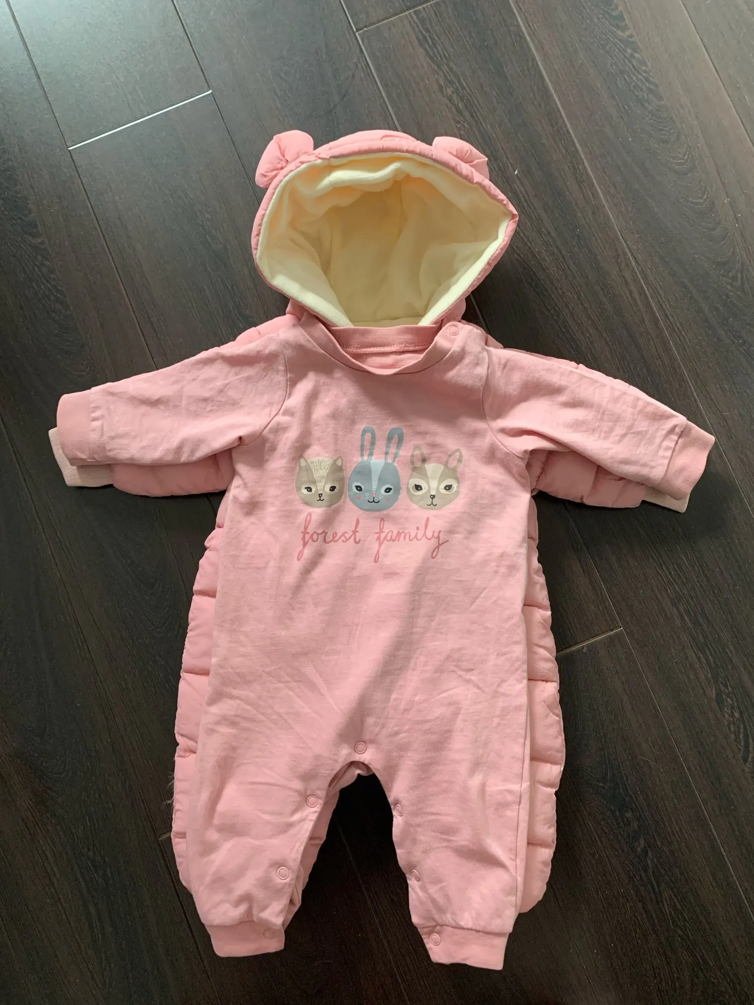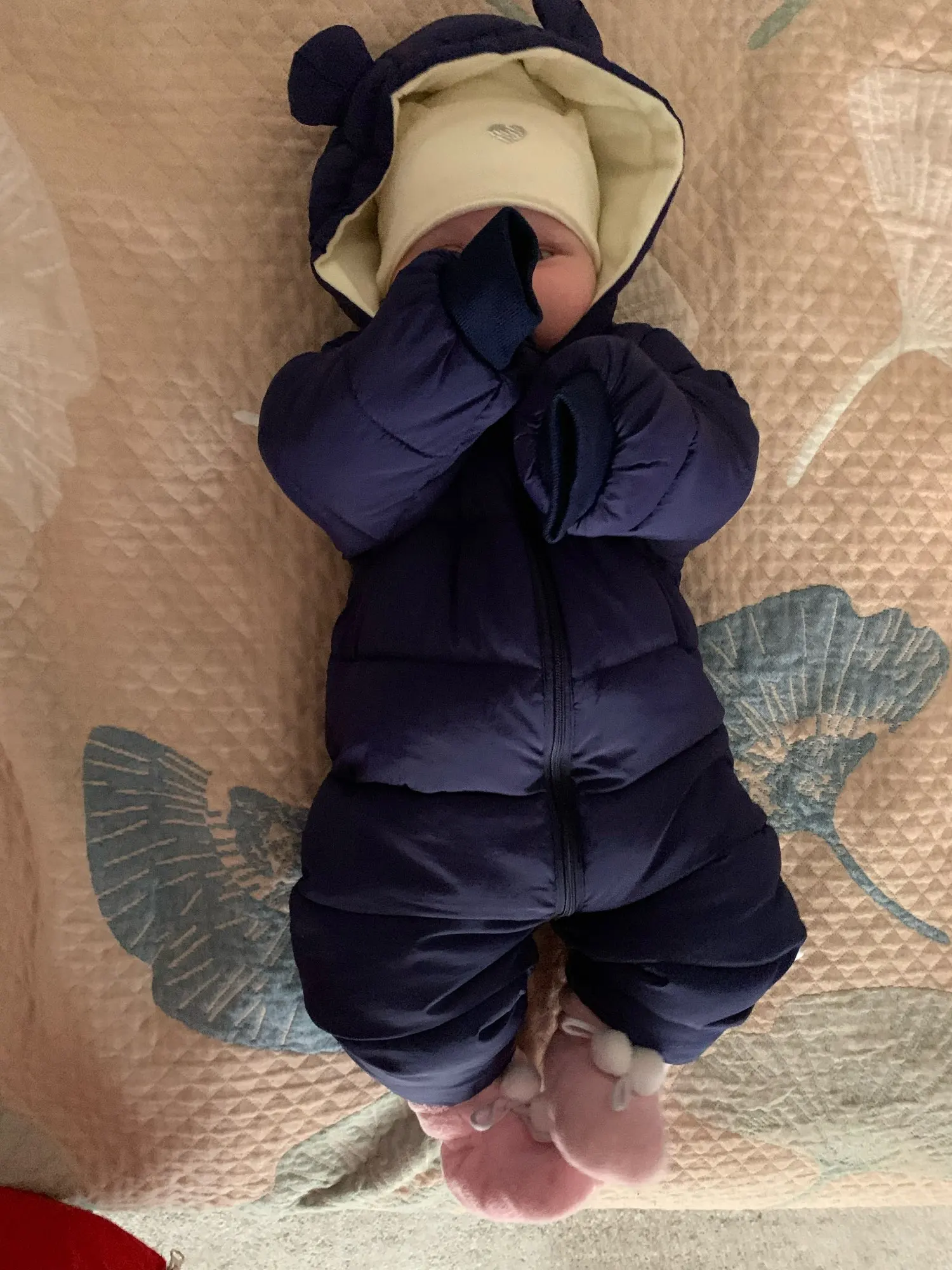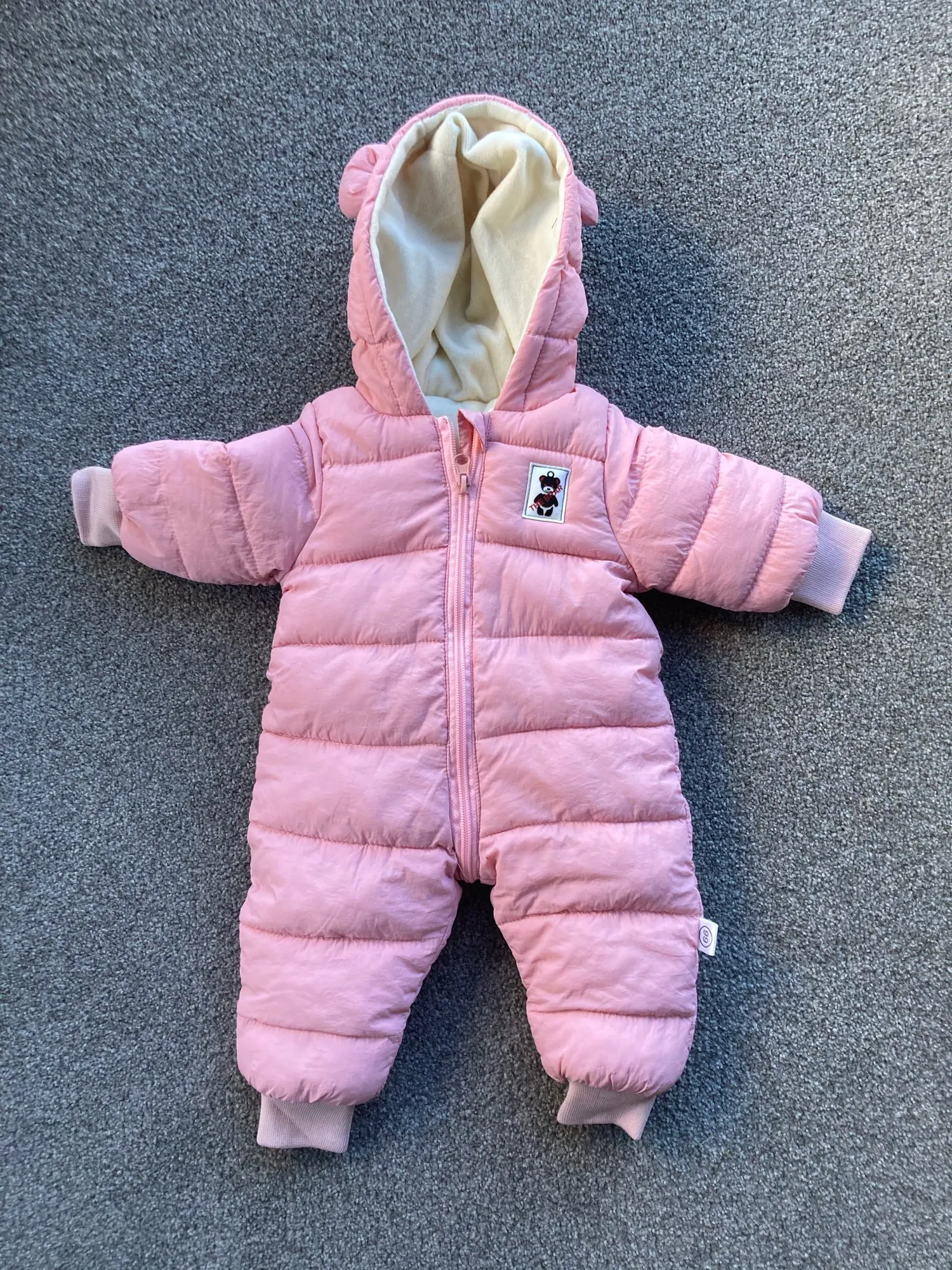 Пришло за 2 недели. Качество неплохое. Ткань верхняя тонкая, зацепки будет видно сразу. Внутри флисовый подклад, в рукавах его нет. Наполнитель лежит равномерно, выдержал стирку с отжимом, не свалялся комьями. По температуре кажется на раннюю весну, зиму холоднее -5 не выдержит. На рост 60см размер 6м в самый раз. Для запаса лучше брать размер больше. Для наглядности прикладываю фото с пижамой 62размера и комбинезоном размера 9м
