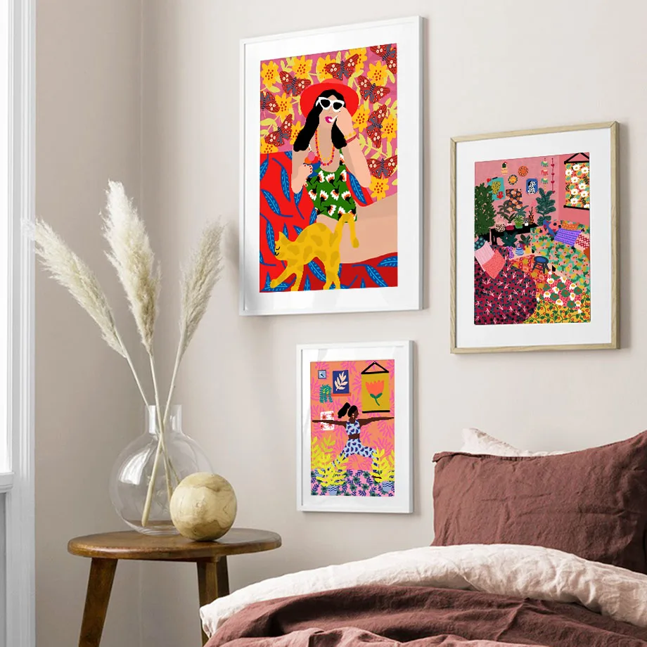 Абстрактные современные постеры и принты красочной выставки девушка...