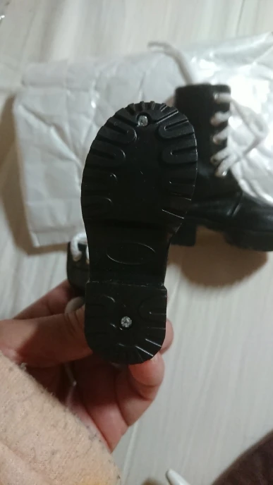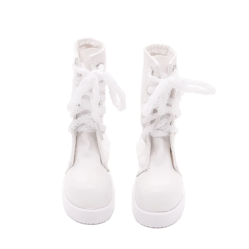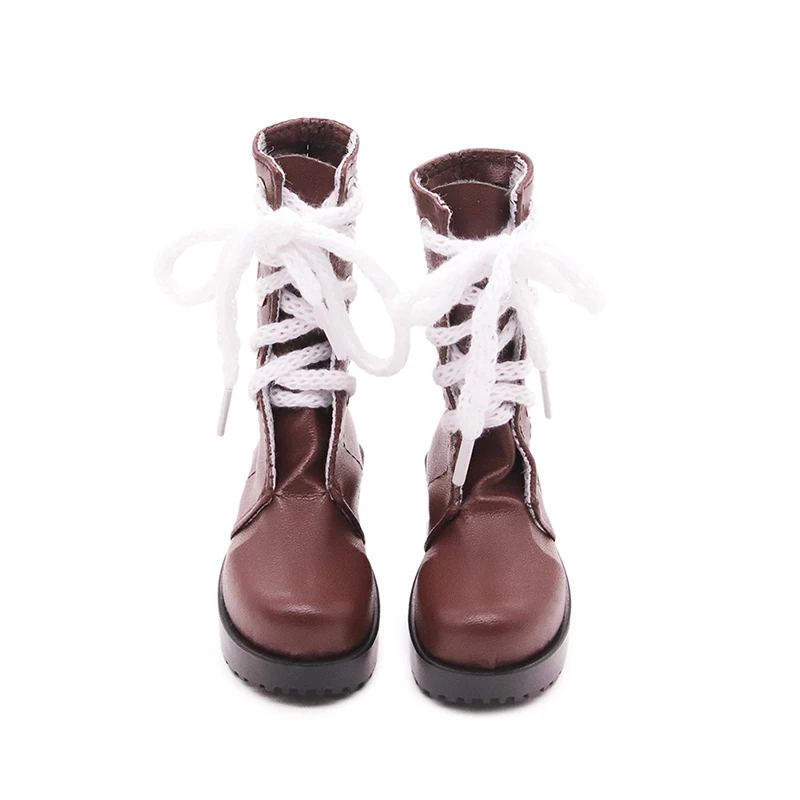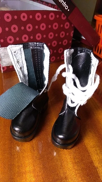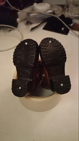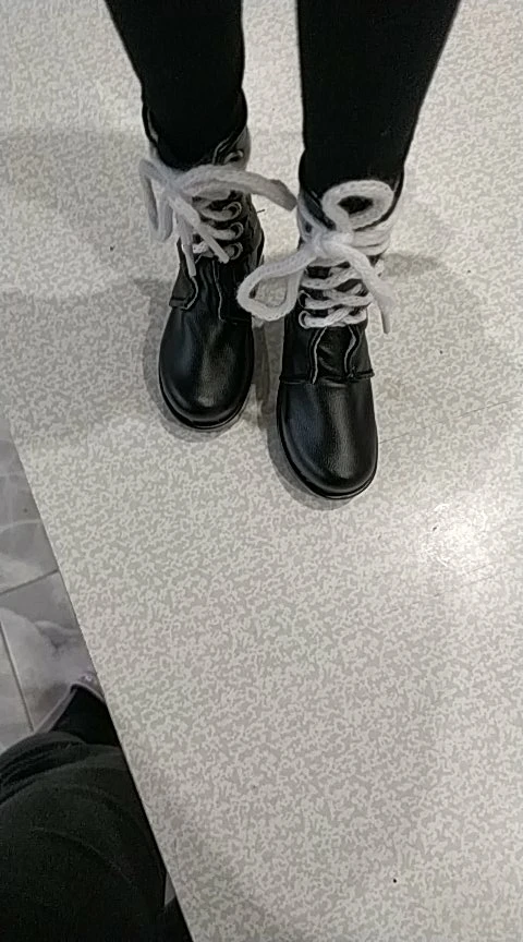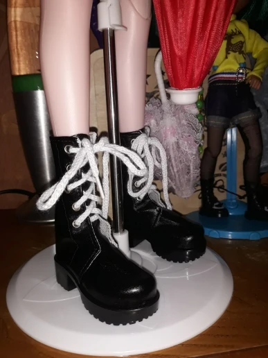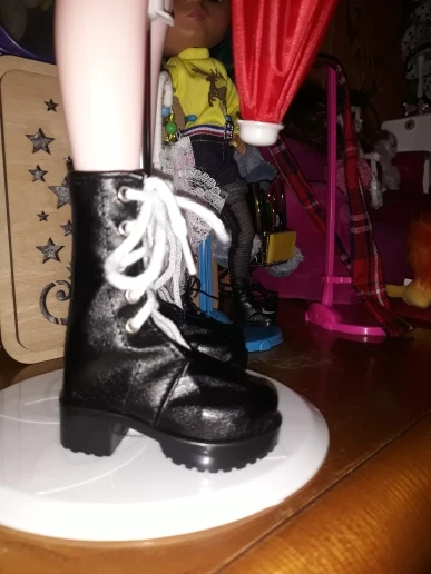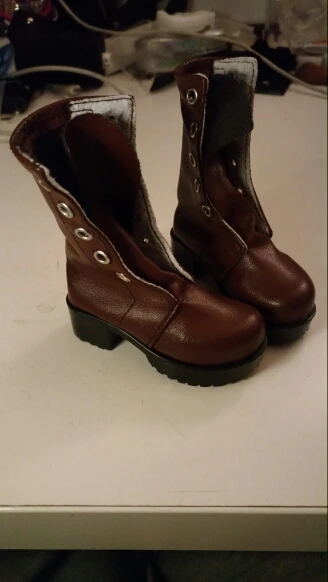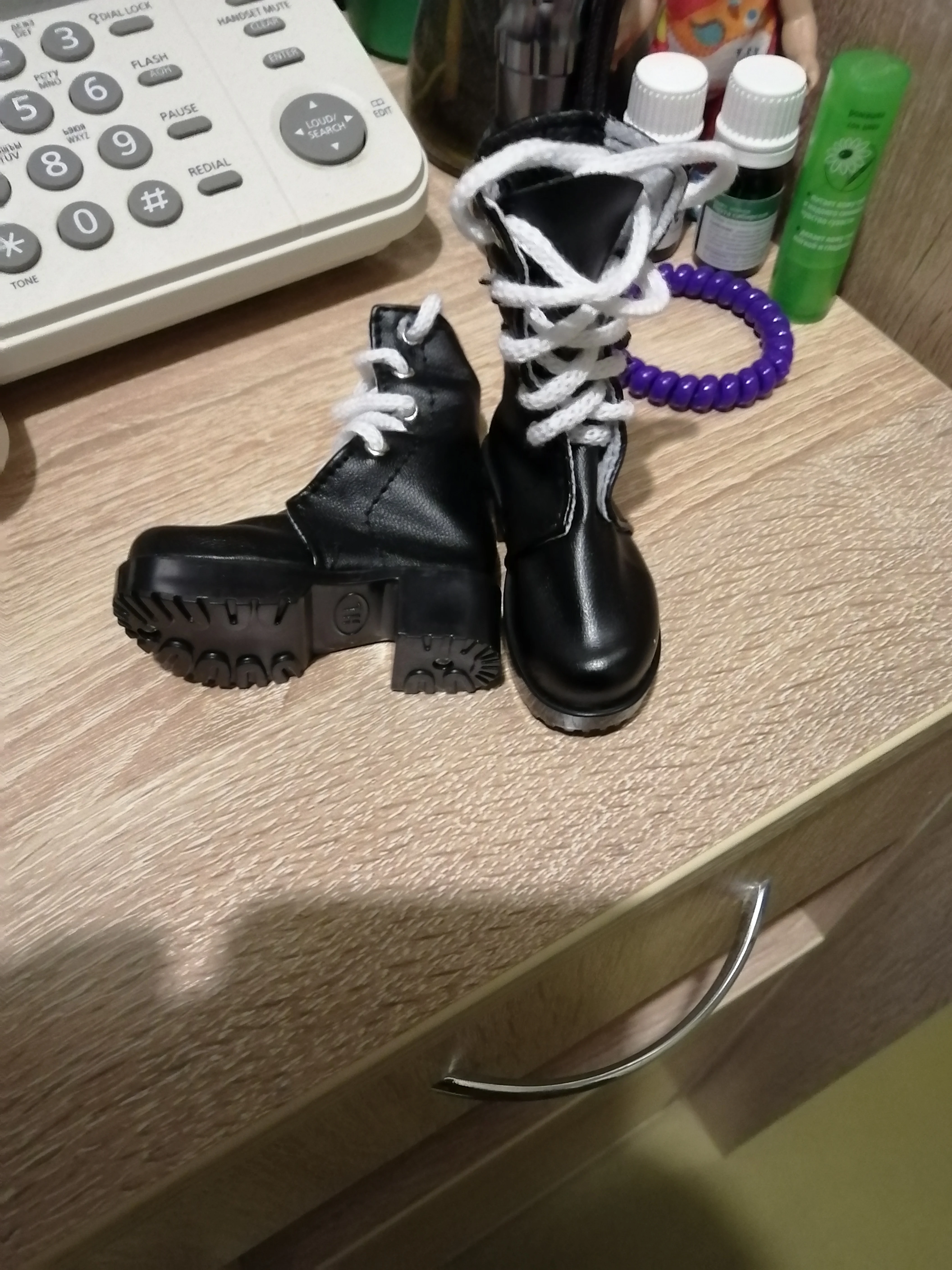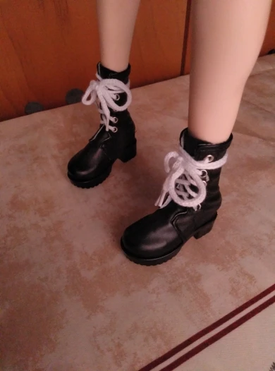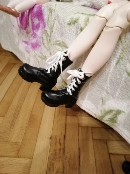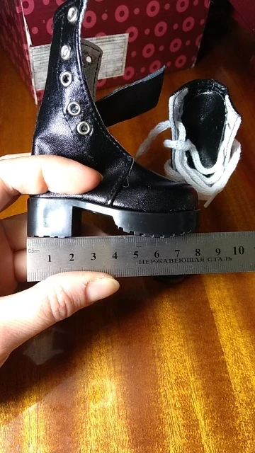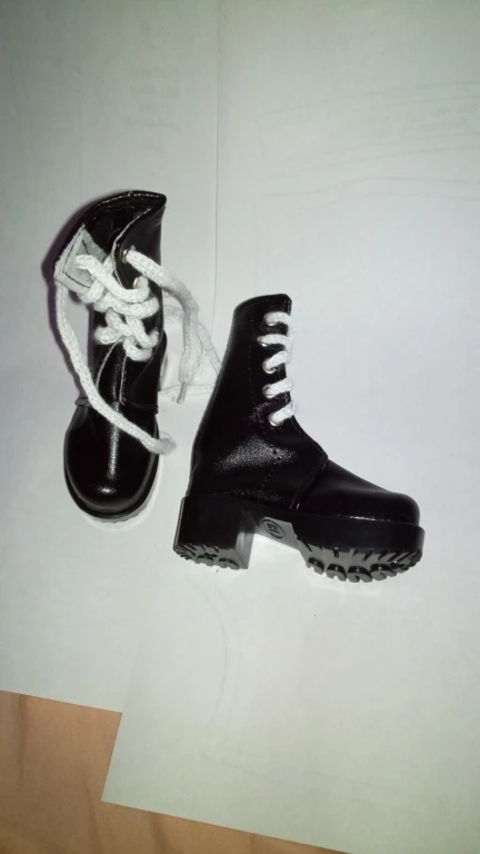 Неплохие ботиночки, не сказать что прямо конфетка, но пойдет. Шнурки сразу вытащила, ибо фуфло. Подошва пластик, неприятно стучит по столу и скользит. Кожа в будущем скорее всего на швах треснет, но на ощупь приятная. Подошва прикручена на саморезы(впервые вижу такое крепление), в пятку не проникает, а вот в носке мешается, если у куколки ступни длинные может не подойти. Сам носок из пластика. Люверсы под шнуровку выпадают, прошлась суперклеем. В принципе норм. Не огонь, но жить можно.