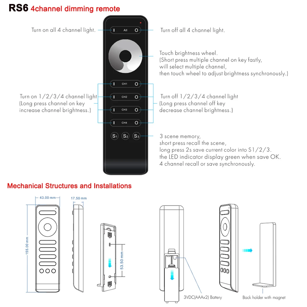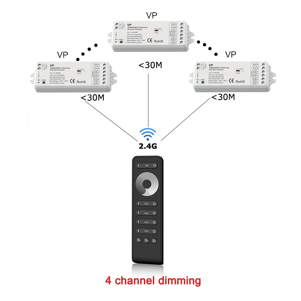 Беспроводной регулятор яркости светодиодный одноцветных светодиодный ных лент, 4-канальный Радиоконтроллер 2,4G, 12 В, 24 В постоянного тока, 15 А, ШИМ