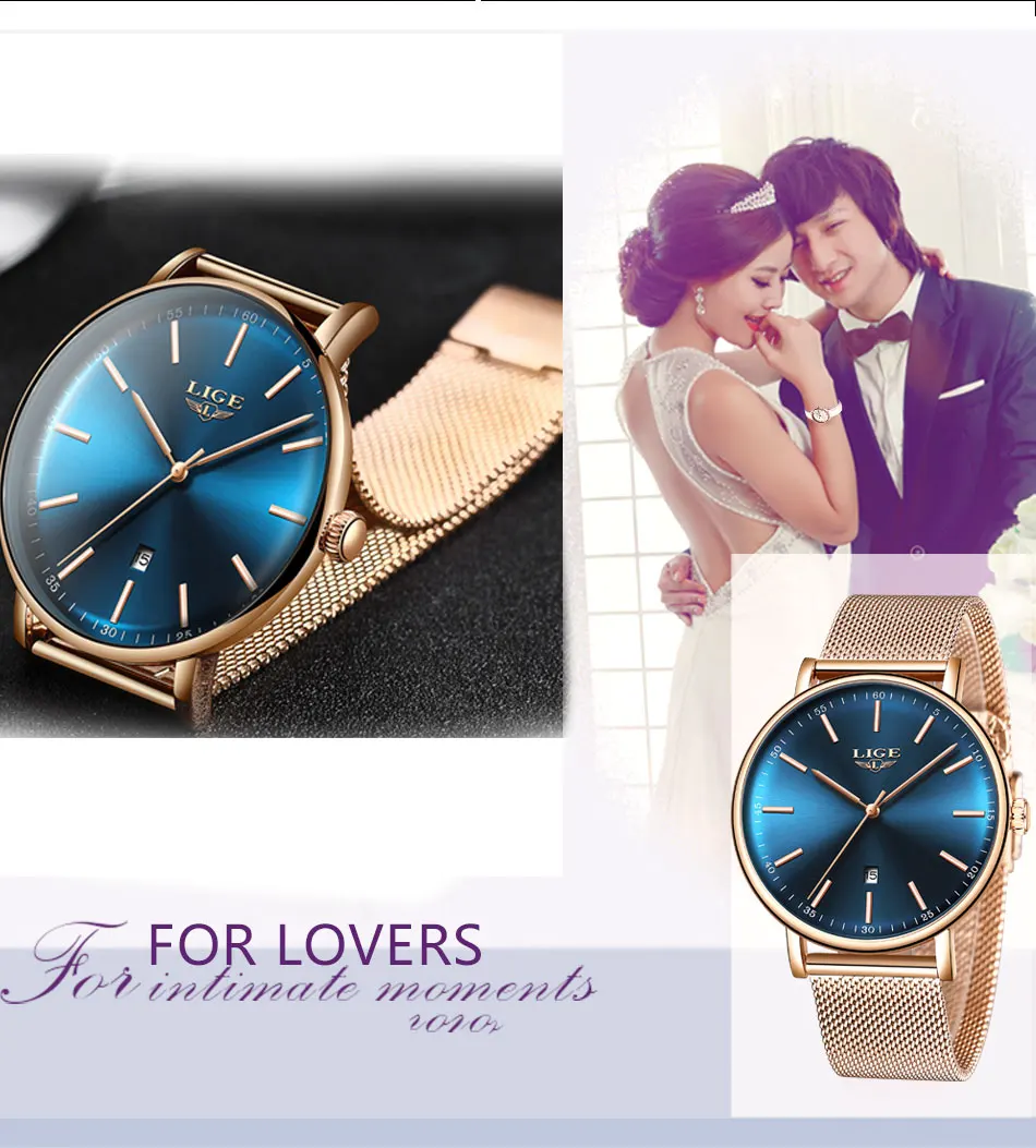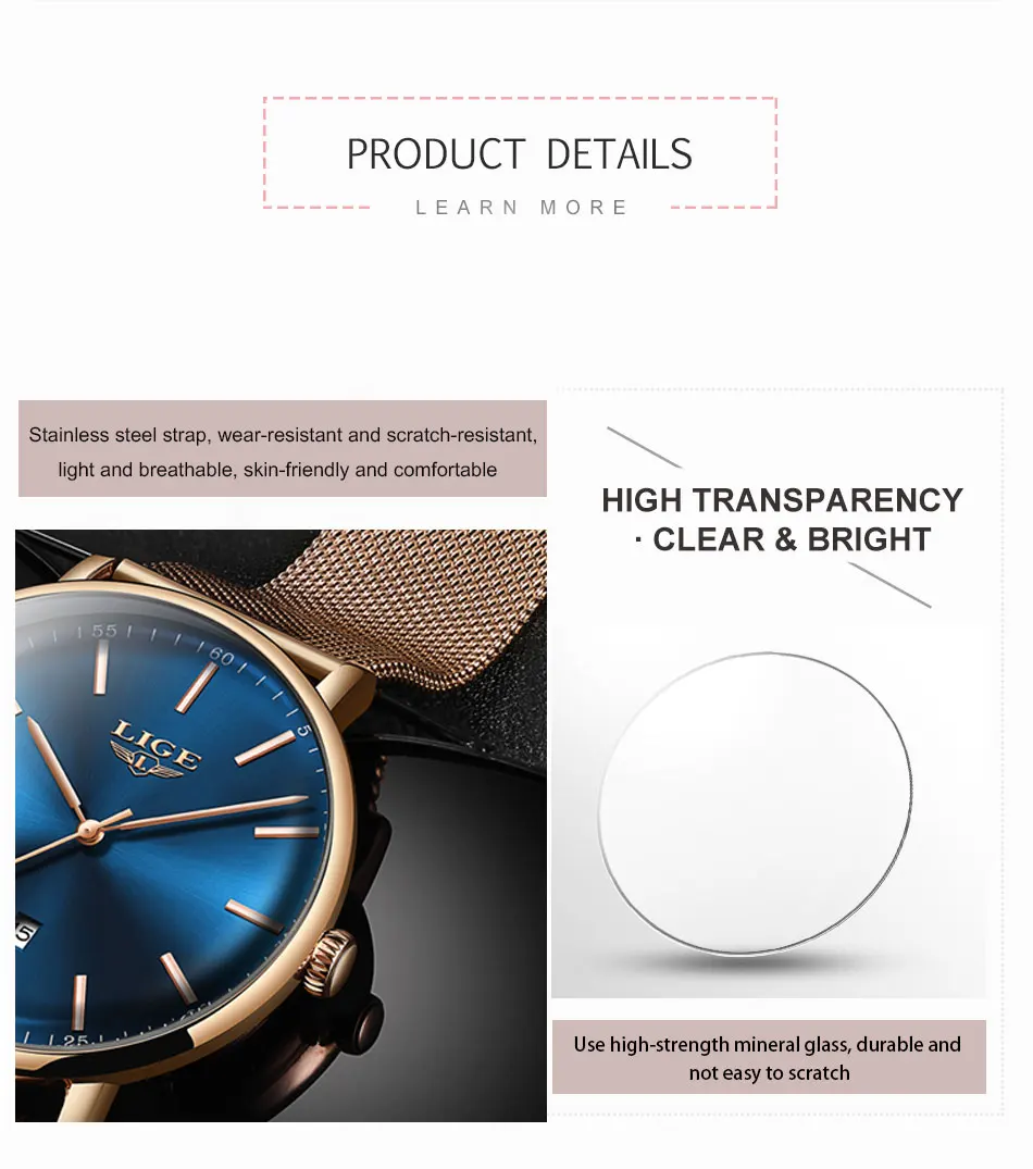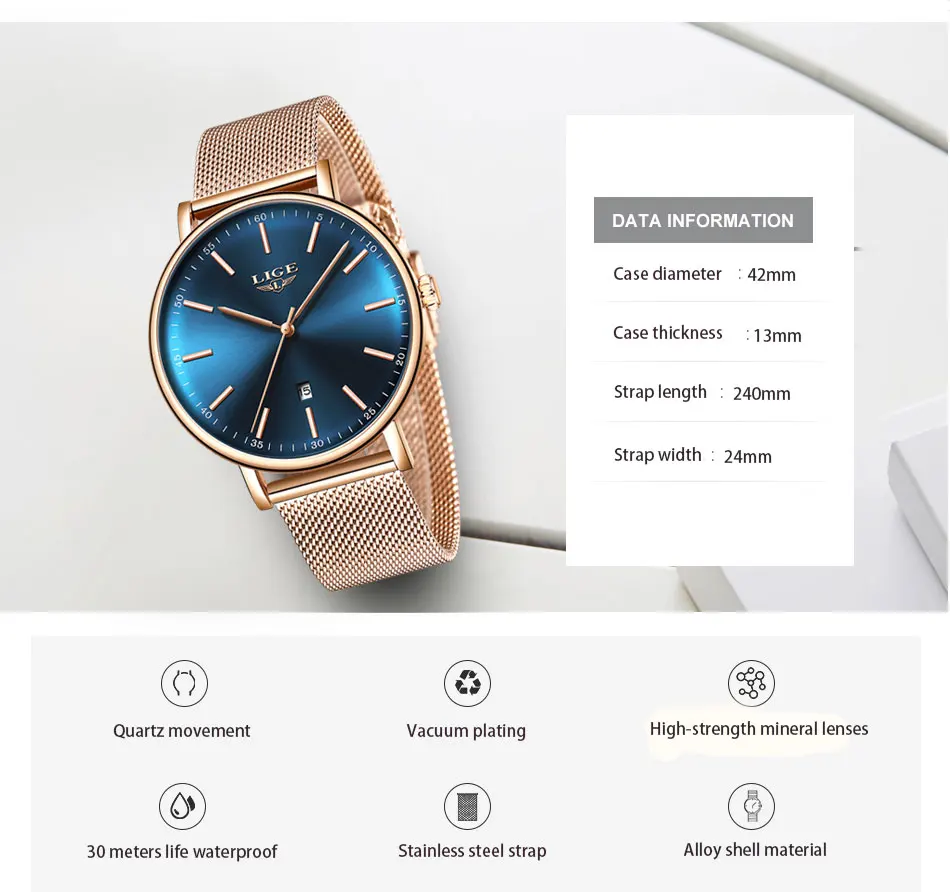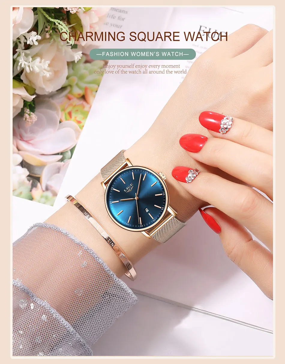 Часы наручные LIGE женские кварцевые, деловые брендовые Роскошные с коробкой, розовое золото