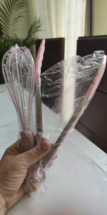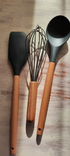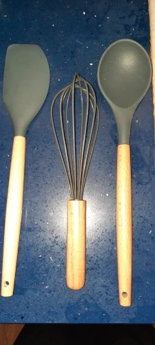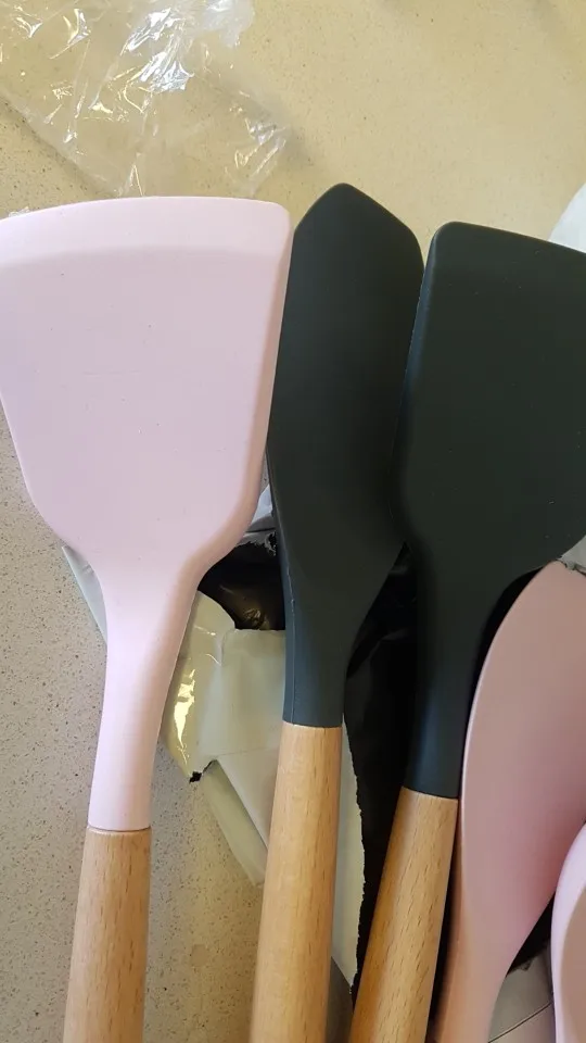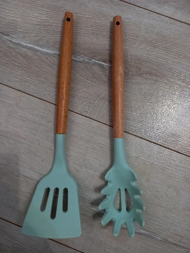 Очень качественные, именно силиконовые приборы с деревянной ручкой. Цвет, форма точно как на фото! Очень довольна!