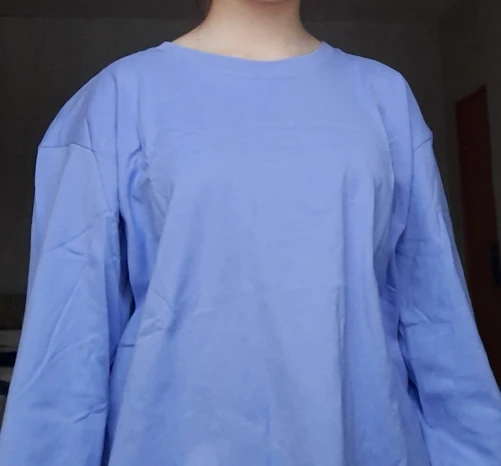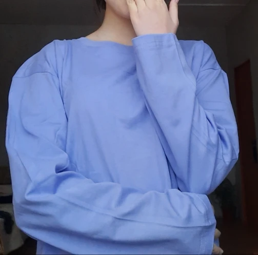 Фотку, к сожалению, не предоставлю, но кто хочет как на картинке, то берите 4XL или 5XL. Лично я брала 4XL белого цвета и мне всё нравится, лонгслив длинный и широкий. Единственное - он немного просвечивает, но это не страшно, буду носить с топом под ним