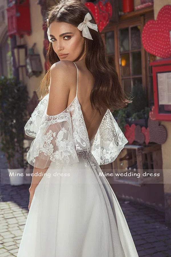 Кружевное свадебное платье-трапеция из тюля с V-образным вырезом и открытой спиной