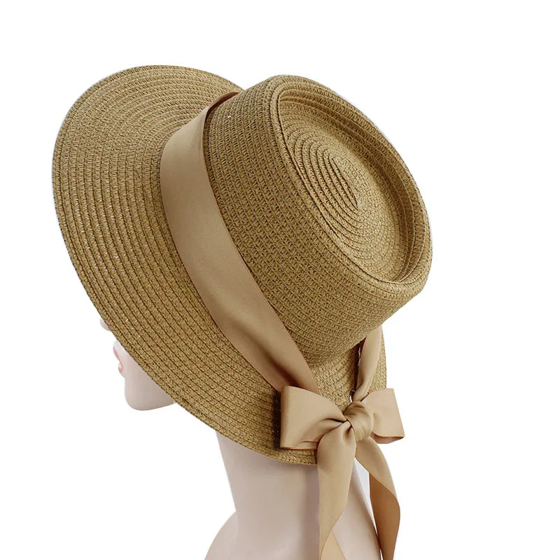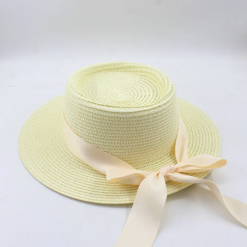Шляпа женская Соломенная с бантом, модная Панама с лентой и плоским верхом, Пляжная Панама в стиле кэжуал, лето