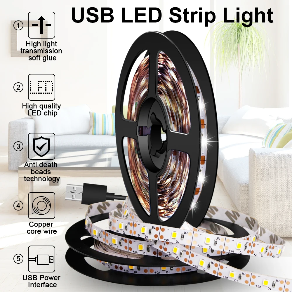 Особенности:*Гибкий светодиодный светильник-полоска, чип высокой яркости, хороший светильник, равномерный и достаточный светильник, решить проблему неравномерного освещения, сделать светильник эффект ing полон жизненной силы, отличный декоративный эффект создает комфортную атмосферу.*Управляется любыми устройствами с выходным usb-портом 5 В, такими как компьютер, настольный компьютер, ноутбук, планшет, таб, автомобильный прикуриватель. И т. д.*3M двусторонний скотч на задней части для гирлянды, может быть напрямую и быстро вставить.*Светодиодный чип высокой цветопередачи, высококачественный светодиодный чип 2835SMD, высокая цветопередача, низкий светильник, долговечный.