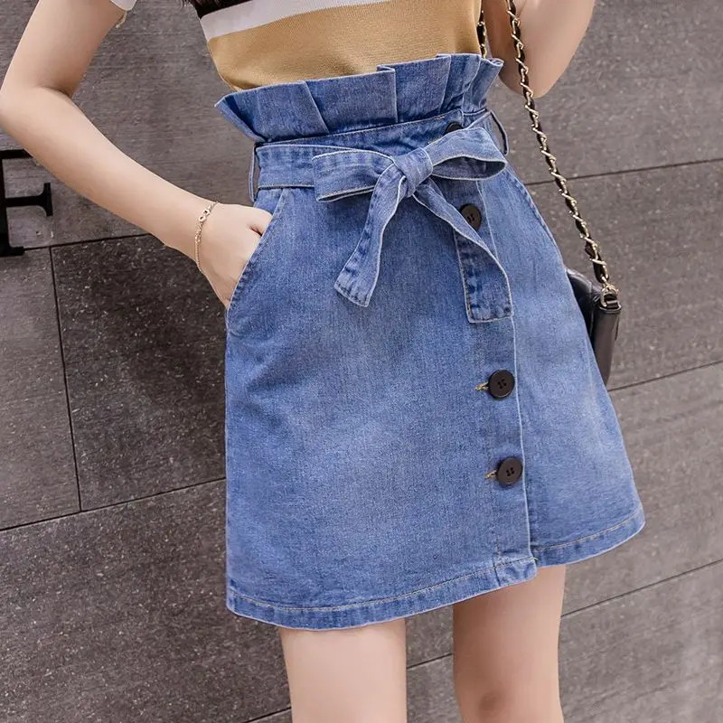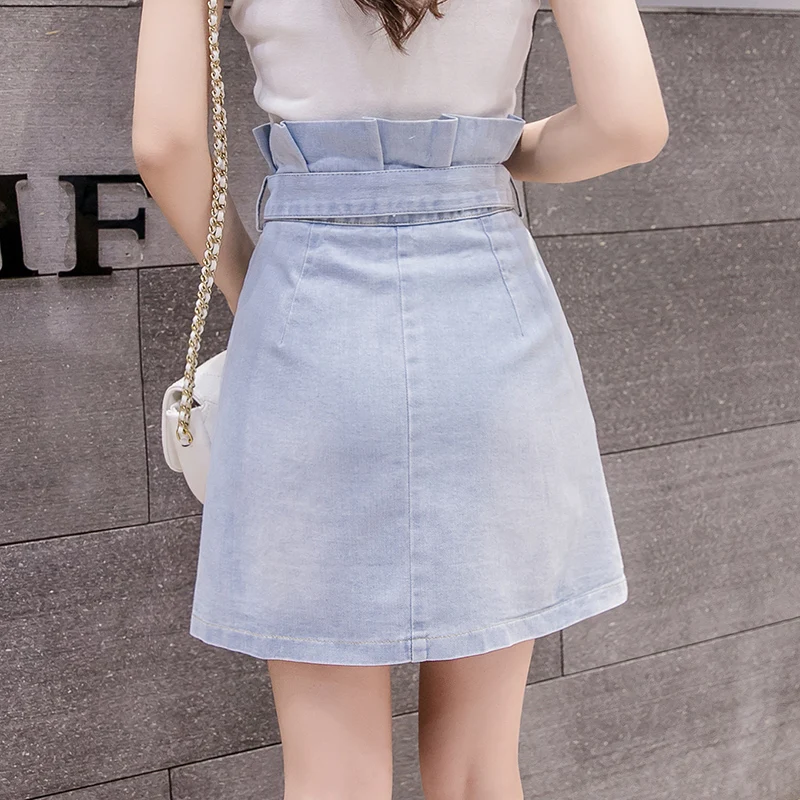 Джинсовые мини-юбки, с рюшами, на пуговицах, с завышенной талией, синие, c108, 2020