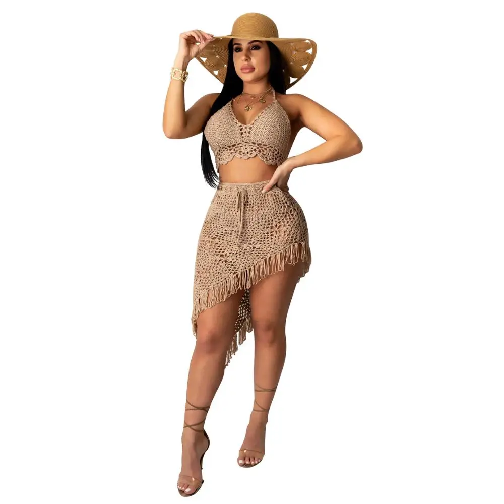 Женский пляжный костюм-двойка, с топом и кисточками, лето трикотажный бюстгальтер