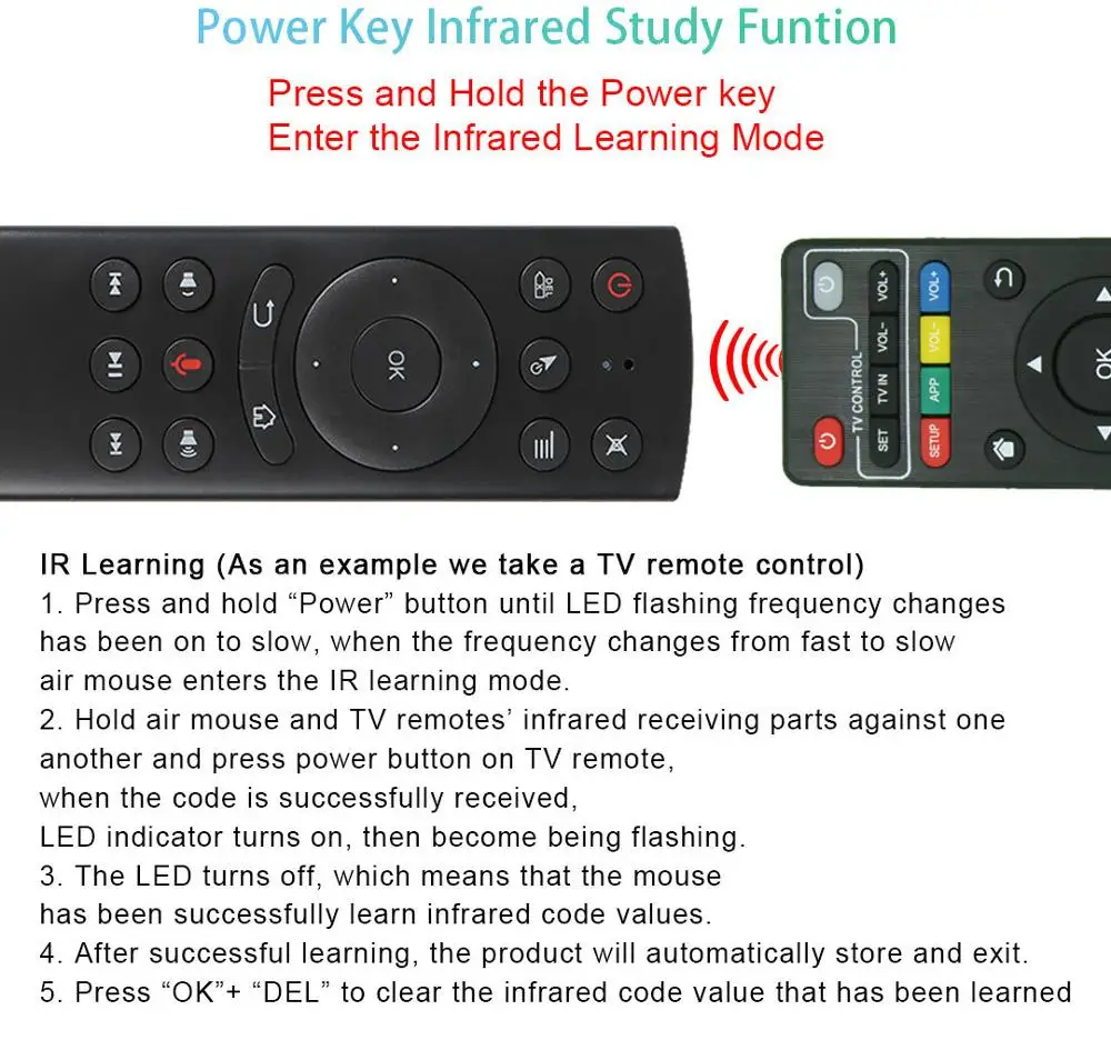 Примечание 2: Эта воздушная мышь может быть несовместима с некоторыми смарт-телевизорами, потому что третий-вечерние USB ключ заблокирован. Вы должны подтвердить, что ваш смарт-телевизор может распознавать вечерние usb-ключ и поддерживать другой пульт дистанционного управления, за исключением оригинального пульта ДУ.