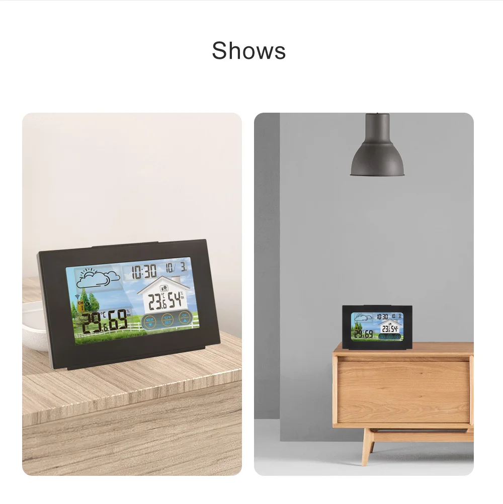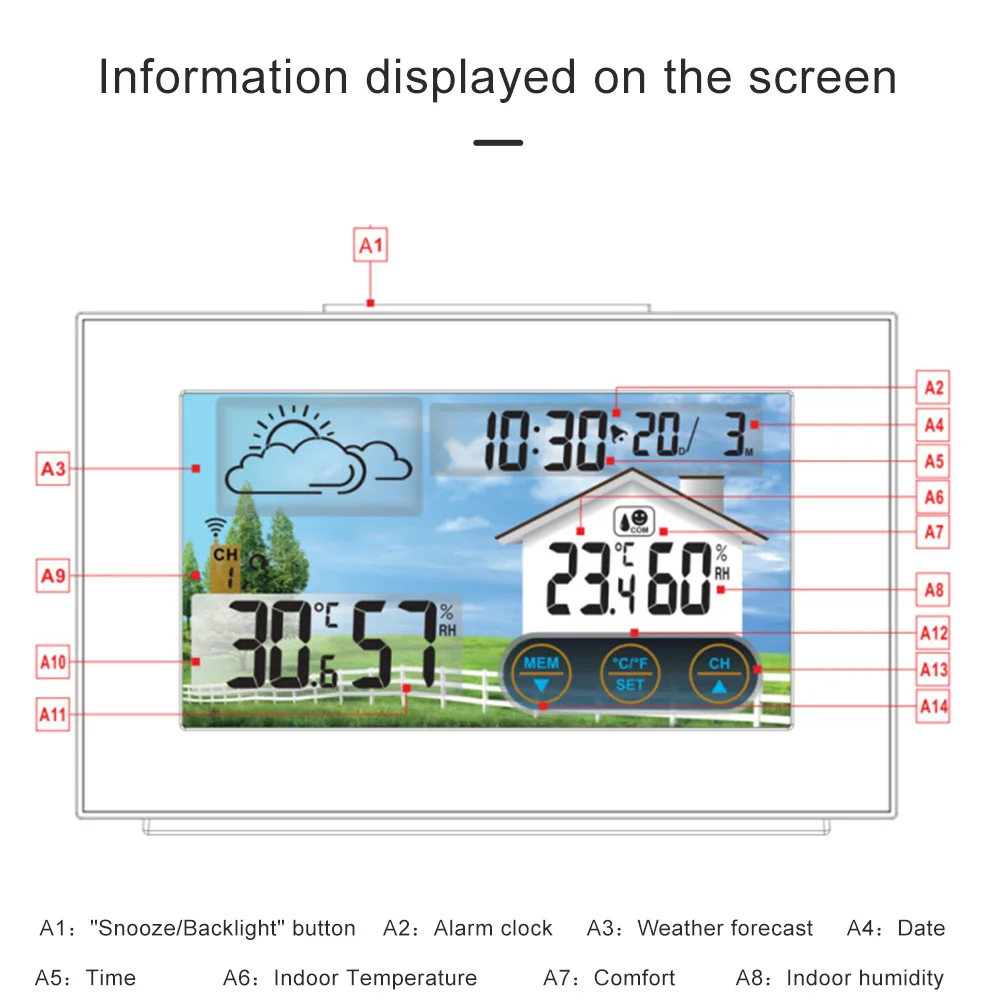 3 кнопки настройки сенсорного экрана⑤ Календарь до 2099Время в опциональном формате 12/24 часов.Функция будильника на каждый деньФункция повтора (5 мин)• Влажность: внутренний и наружный измеряемый диапазон: 20% RH ~ 95% RH• Температура:-Диапазон измерения температуры в помещении: 0 °C (32 °F) ~ 50 °C (122 °F)-Наружные диапазоны измерения температуры: -40 °C (-40 °F) ~ 70 °C (158 °F)-Температура Альтернативная в °C или °F.Уровень комфорта в помещении 3⑤ Максимальная/минимальная запись температуры и влажностиБеспроводной наружный Датчик:-Настенное крепление или настольная подставка-Частота радиочастотной передачи 433,92 МГц-Дальность передачи 60 метров на открытой местностиФункция прогноза погоды⑤ 4 уровня яркости для подсветки> Погодные станции могут принимать до 3 каналов беспроводных датчиков, только 1 в комплекте.► Питание:Погодная станция:Аккумулятор: 2 х LR6 AAВходная мощность USB: 5 в пост. Тока (входной ток больше 500 мА)Беспроводной наружный Датчик:Аккумулятор: 2 х LR6 AA