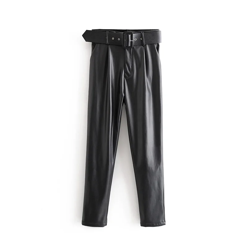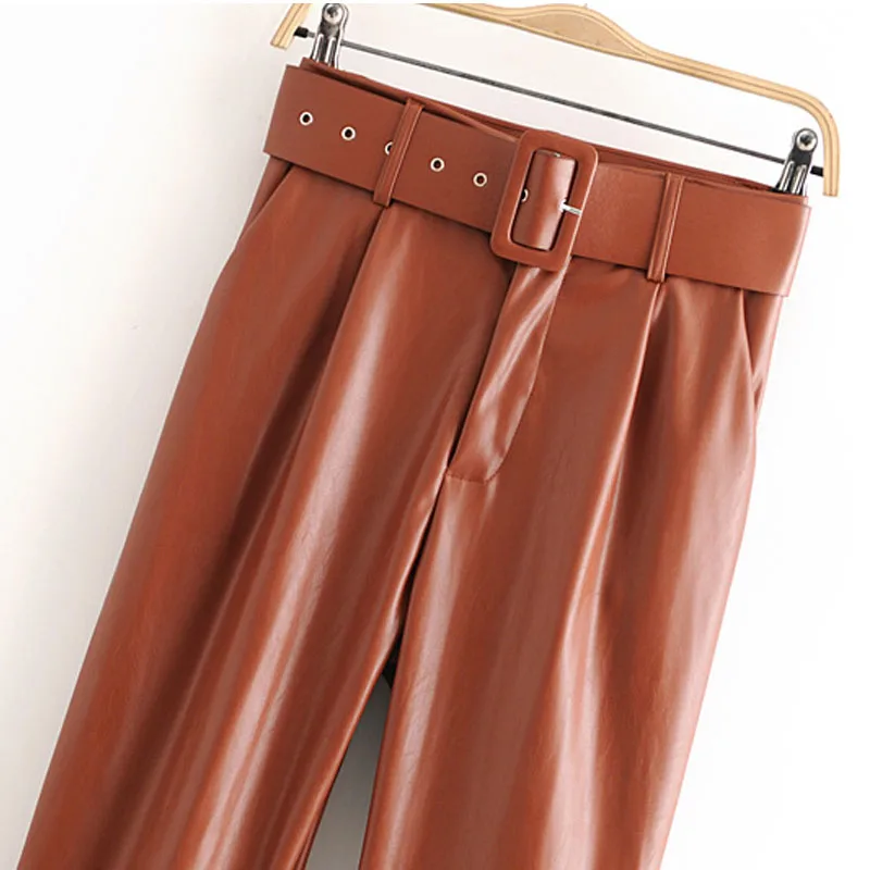 Женские брюки из искусственной кожи с высокой талией, тонкие стройнящие брюки с поясом, черные ветрозащитные шикарные женские брюки плюс бархатные теплые модные женские кожаные брюки