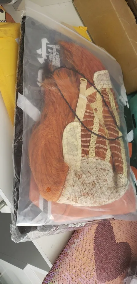 Пришла посылка очень быстро. Меньше 2-ух недель до МО. Парик немного лысенький, но не критично; сейчас происходят попытки его уложить. Костюм хороший, плотный и в сеточку, так что жарко не будет. Было несколько торчащих ниток, но не критично. Взяла размер L на рост 173~175, ОГ - 85, ОБ - 94; мой инст: angln.kr