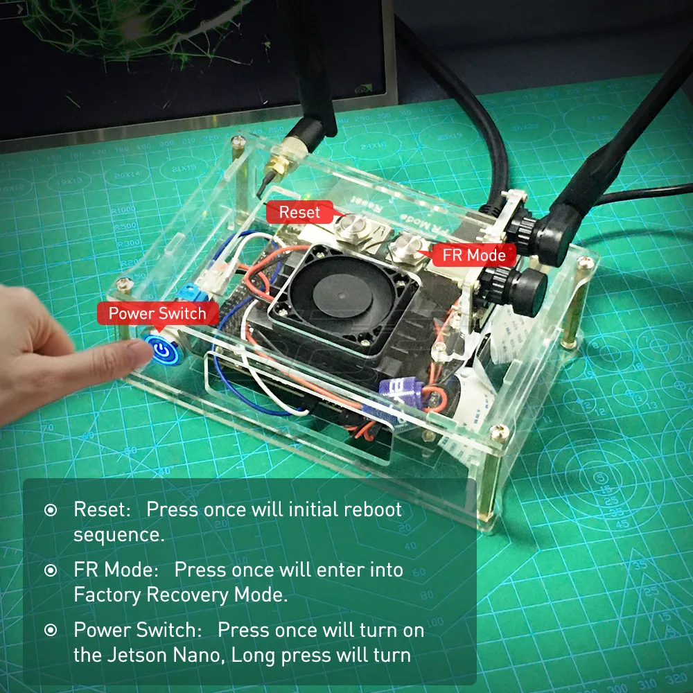 Это прозрачный чехол из акрилового материала, который защищает материнскую плату jetson nano и помещает две камеры. Боковые отверстия позволяют легко получить доступ к GPIO. Предусмотренная кнопка сброса, кнопка включения питания и кнопка режима FR позволяют включать ваш Jetson Nano. Очень удобно сбрасывать и восстанавливать настройки внешнего вида. Этот чехол подходит для версии B01 Jetson Nano. Кронштейн двойной камеры также изготовлен из акрилового материала, что очень красиво.
