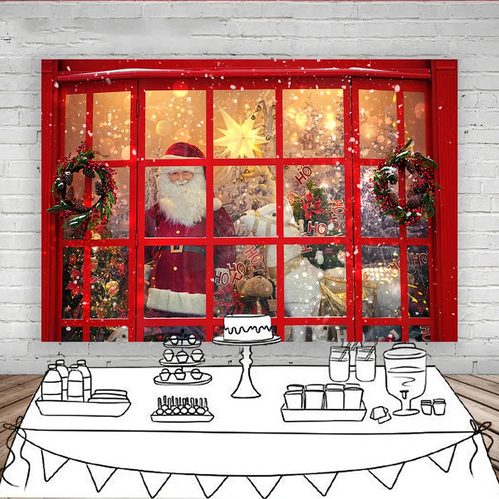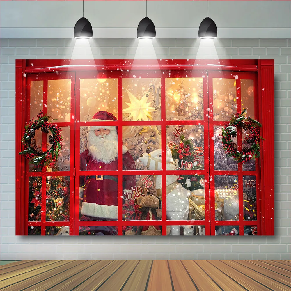 Фон для студийной фотосъемки с рождественским Санта Клаусом, окном магазина, рождественской елкой, колокольчиками