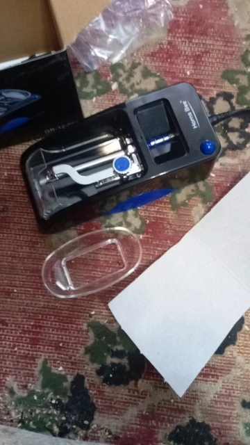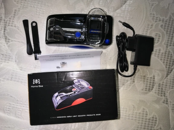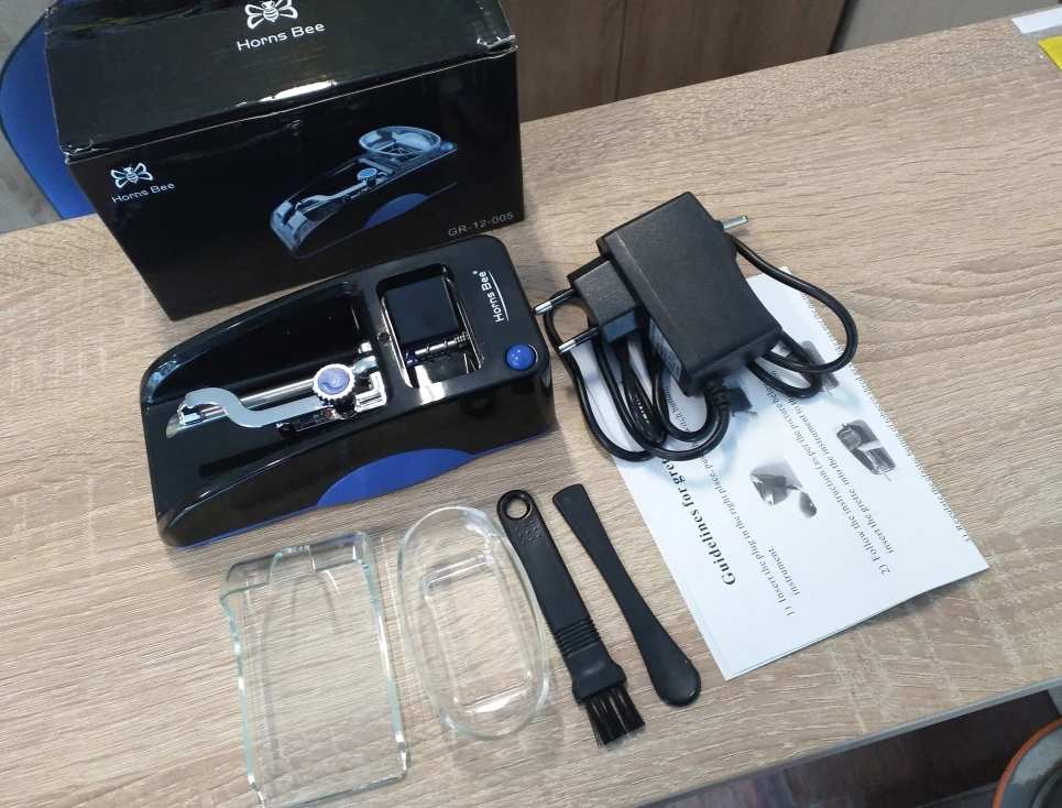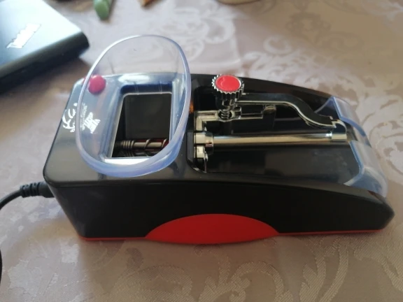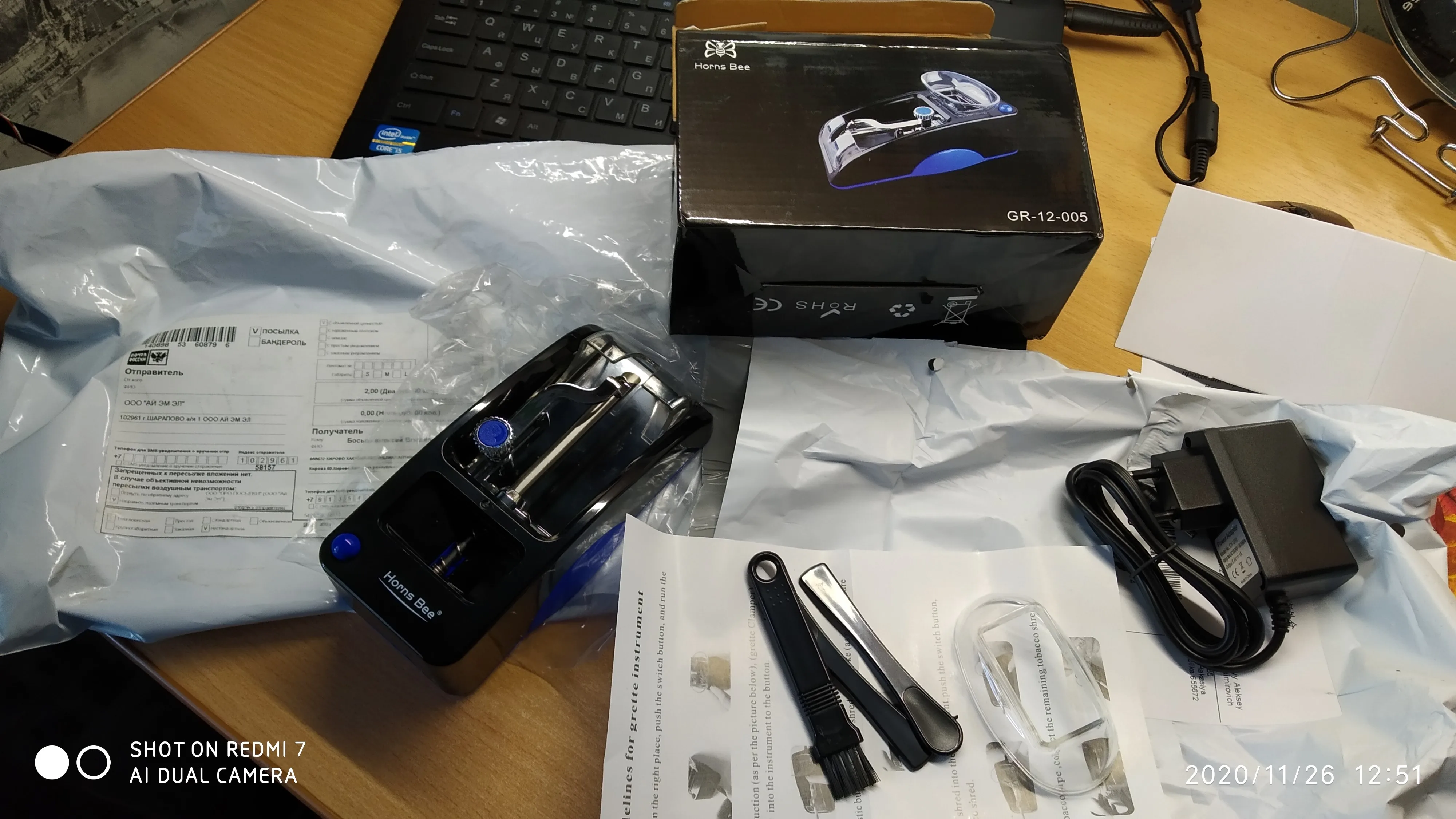 Машинка долетела за 5 дней доставкой IML со склада в России курьером до двери. Машинка полностью соответствует описанию. C родным блоком питания на 8 вольт очень шумная и табак набивает очень плотно можно глаз выколоть. Уголек постоянно самопроизвольно отлетает, уже прожёг трико, приходится постоянно следить. Регулировка винтом не помогает, точнее так для вида. В интернете показано, как укорачивают шток, но на моей он уже укороченный. Частично решил проблему плотной набивки, другим блоком питания на 6 вольт 1 ампер и потише стала и набивка послабее. А так намного удобнее и быстрее, чем простой набивать, хоть стандатные гильзы, хоть сотки.