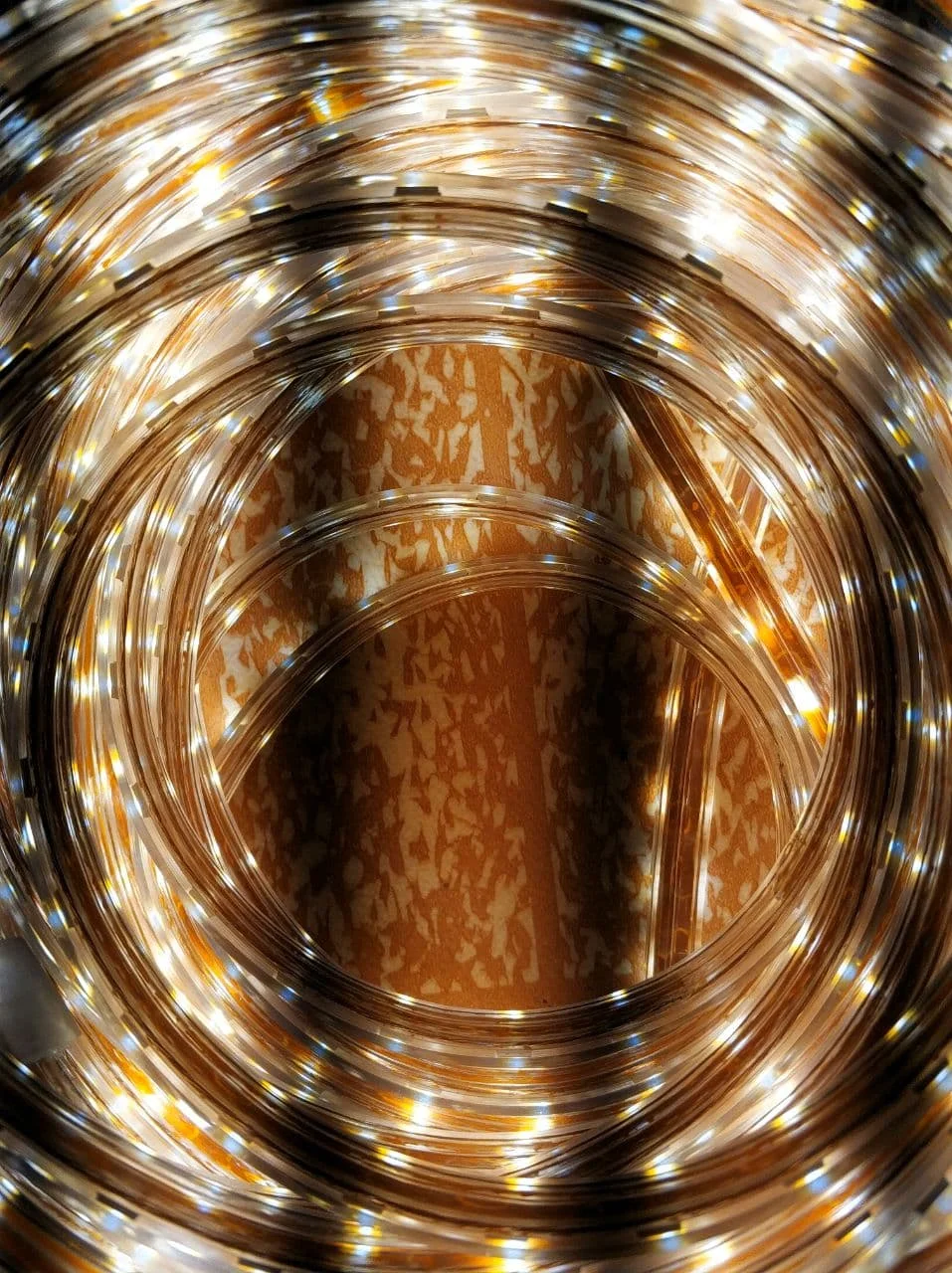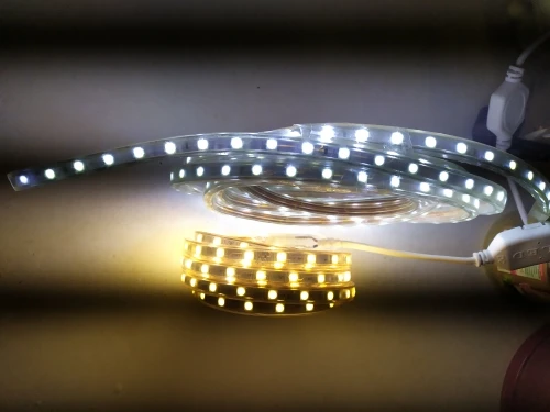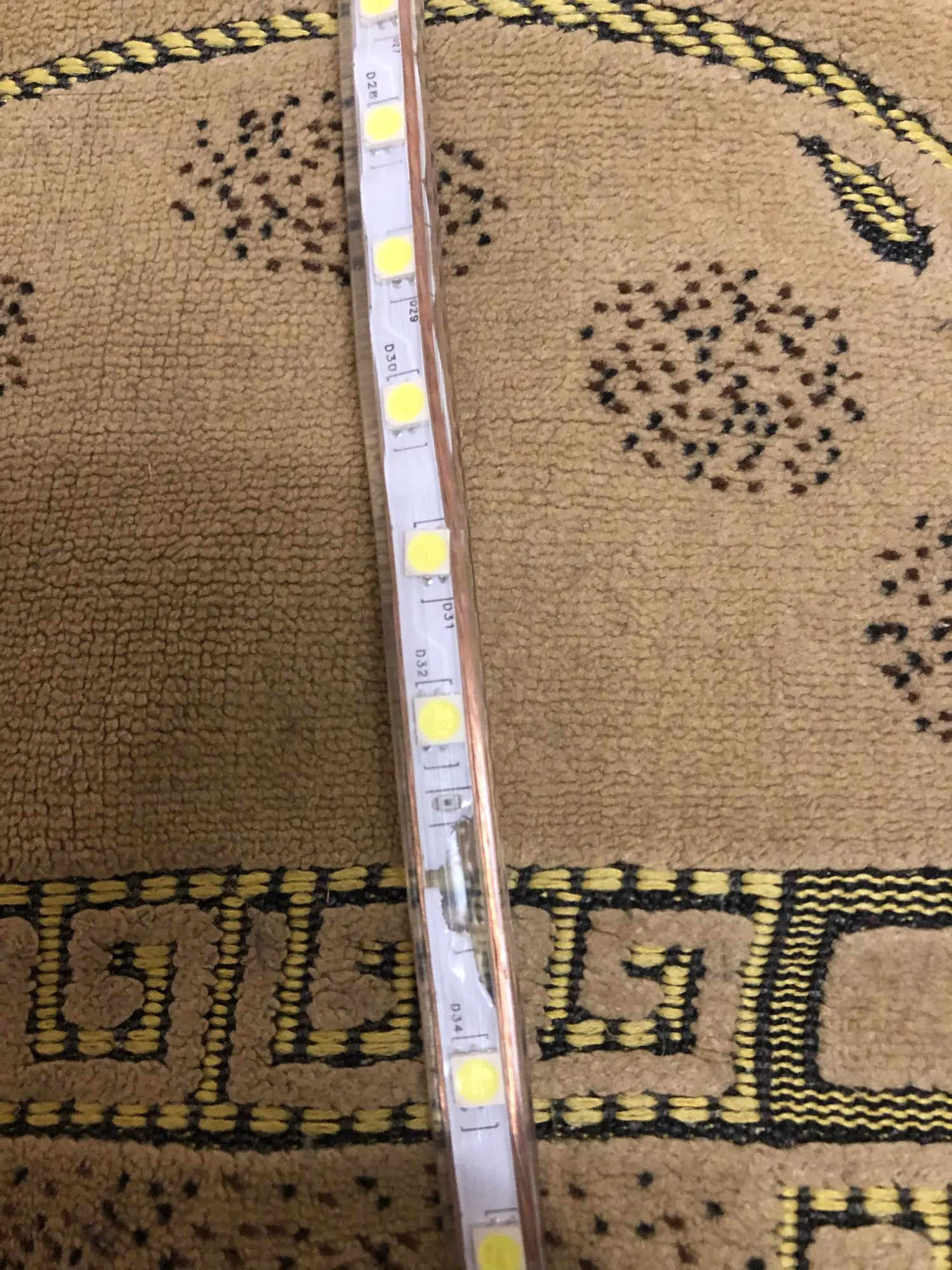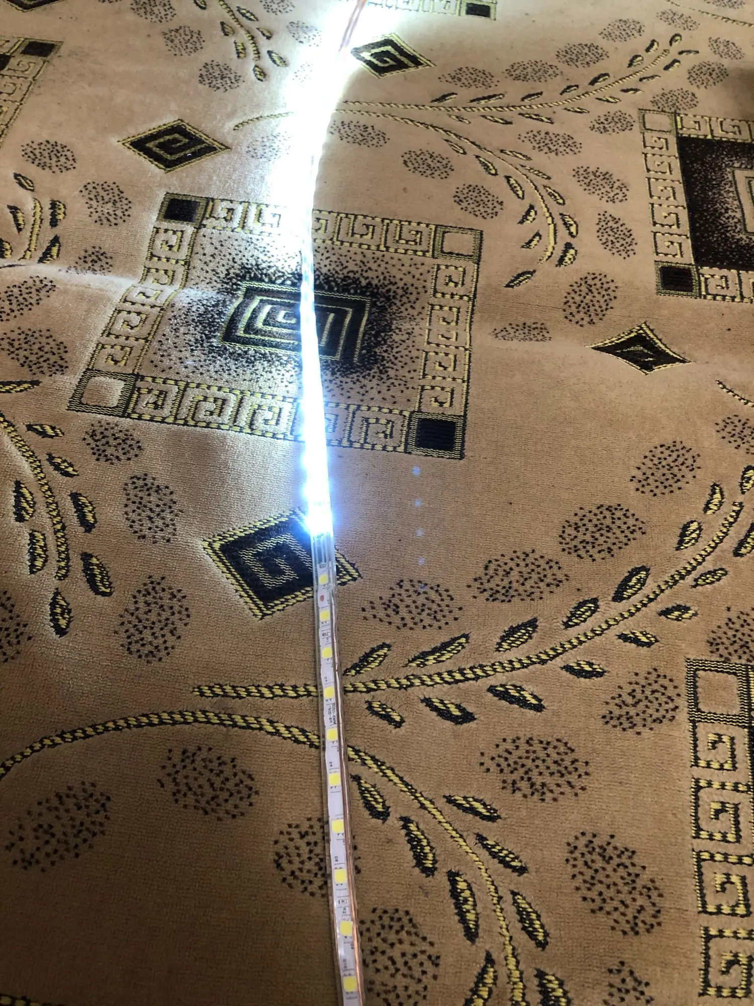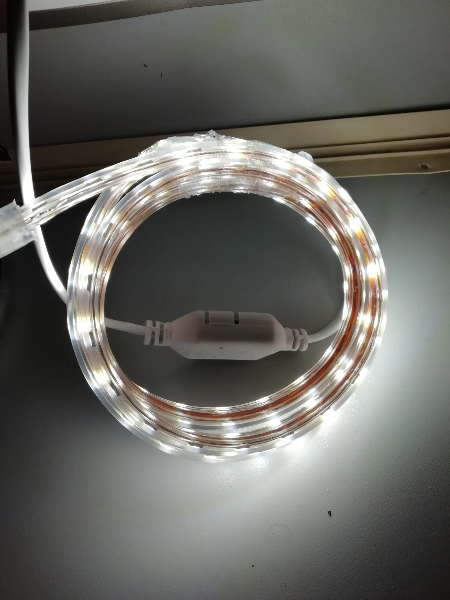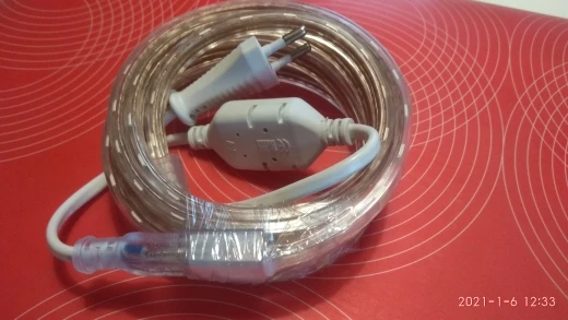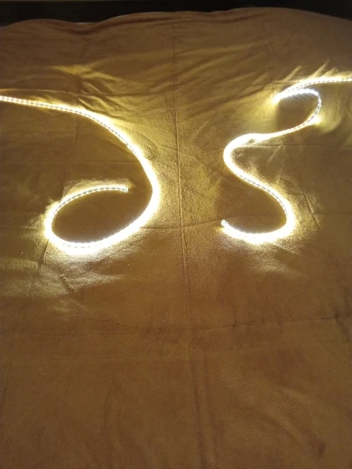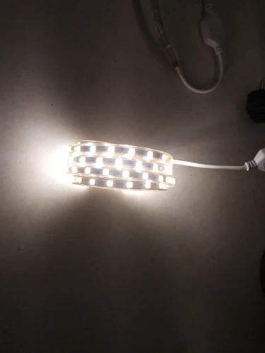 Лента сначала конечно производит впечатление - добротно выглядит, качественная силиконовая оплетка. В процессе эксплуатации выяснился главный недостаток - мерцание ленты (черные полосы на фото - это следствие мерцания ленты). Отсутствие какого-либо драйвера даёт о себе знать, поэтому для интерьерного освещения крайне не рекомендую. 20м лента потребляет 45 ватт, это немного меньше заявленного 2.88 ватт/м. И всё равно световой поток от ленты для 45 ватт маловат, большая часть энергии идёт на обогрев помещения. Для комнаты лучше взять линейный светильник из озона за 500 рублей, он не мерцает, потребляет всего 18 ватт, а светит ярче. Лента отправится на улицу освещать дорожку, для этих целей сгодится.