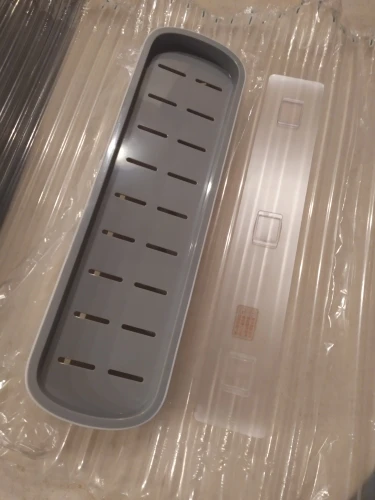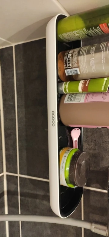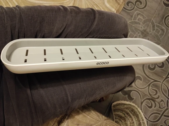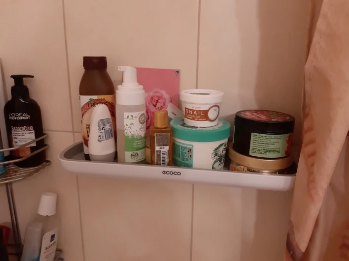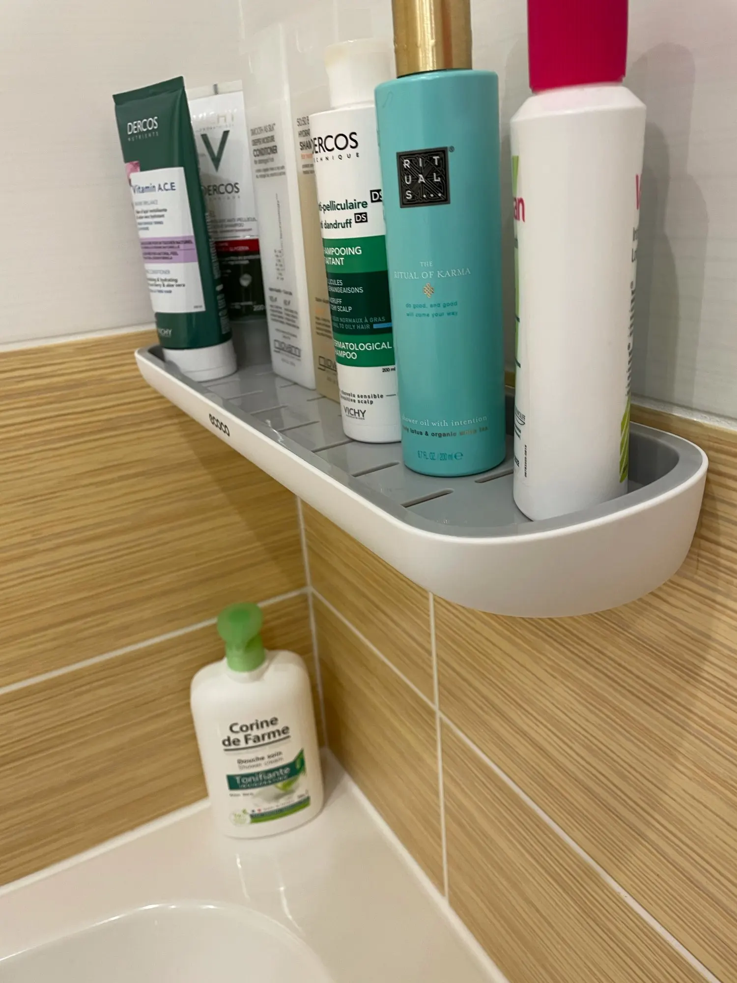 Отличный товар и супер быстрая доставка. В Украину за 3 недели. Рекомендуется для покупки у этого продавца. Полка приятная на ощупь, крепкий пластик. Случайно дотронулся углом липучки к стеклу - крепко прилипла, медленно смог оторвать. Так что уверен - под водой в душе будет крепко и долго держаться.