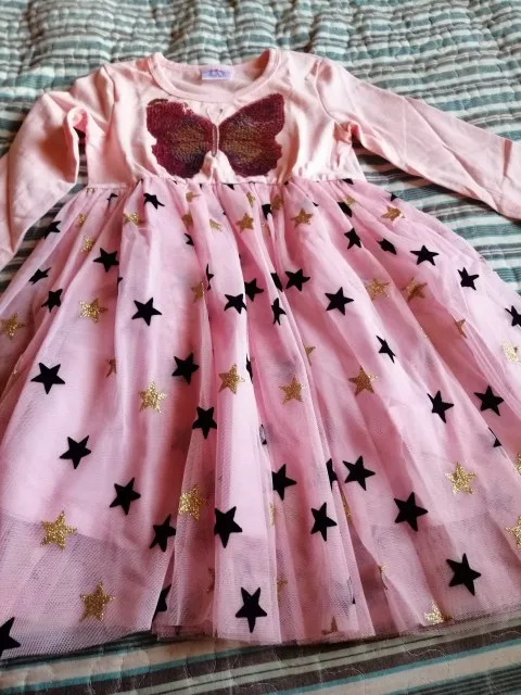 Это очаровательное платье из очень приятной ткани! Мои дочери тоже любят переодевание блесток. Верный размер. На фото показан размер 5/6 для моей дочери 6 лет. Быстрая доставка!