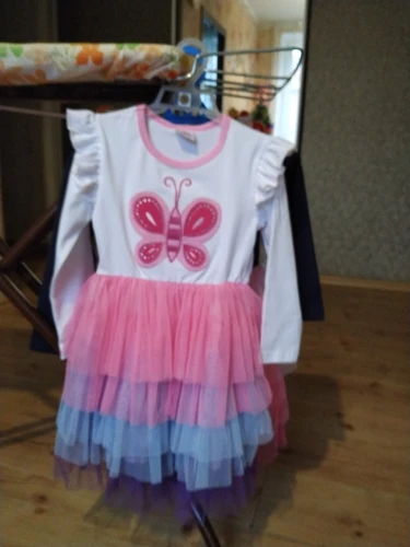 Красиво, я в восторге от платья, расшитая блестками бабочка выглядит потрясающе, я уверен, что моей племяннице тоже понравится. Заказанный размер 4, на ярлыке 3-4 года, соответствует европейскому размеру 98/104. Доставка занимает больше времени, заказал 01/30, получил 03/17.
