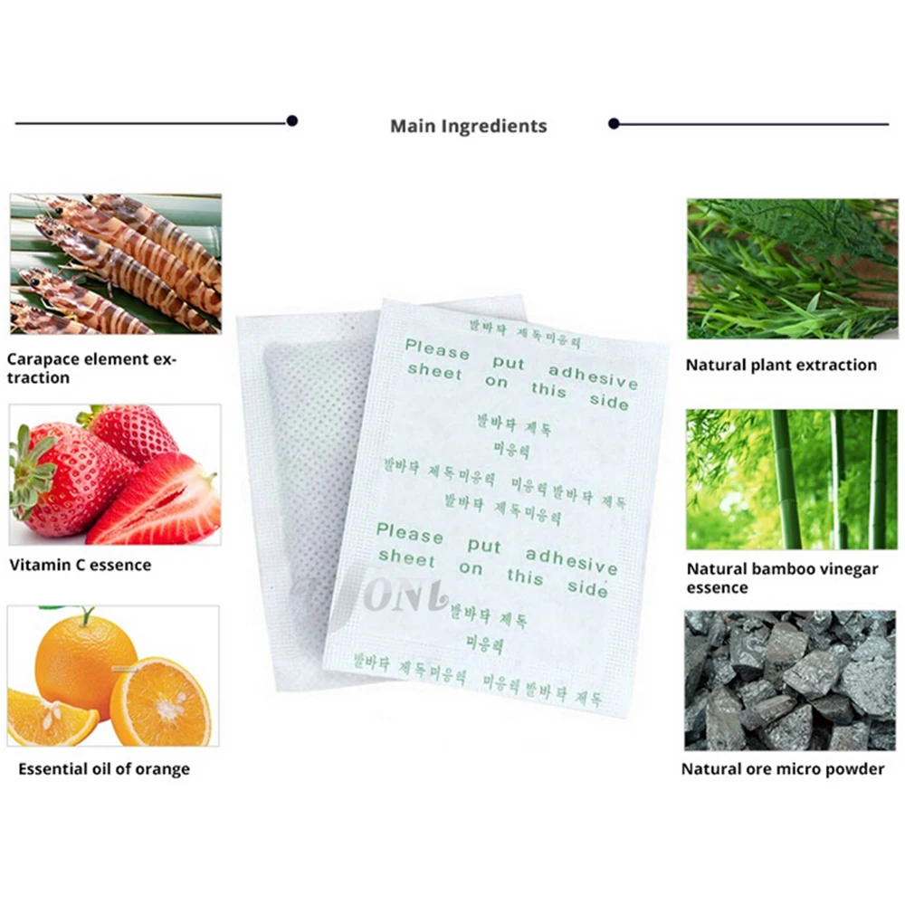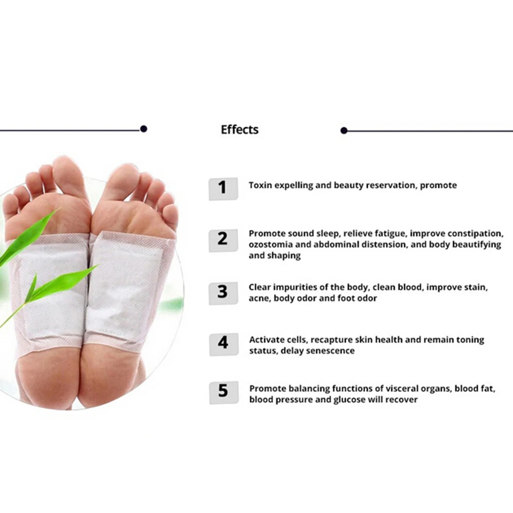 Подушечки для ног содержат натуральные ингредиенты, которые стимулируют эти акупунктурные точки через комбинированное действие дерева/бамбукового уксуса, дальней инфракрасной энергии и отрицательных ионов выбросов. Эта стимуляция приводит к поломке воды и молекул отходов, которые бесплатно блокируют кровообращение и лимфатические системы. Очищение начинается естественным образом на подошвах наших ног.