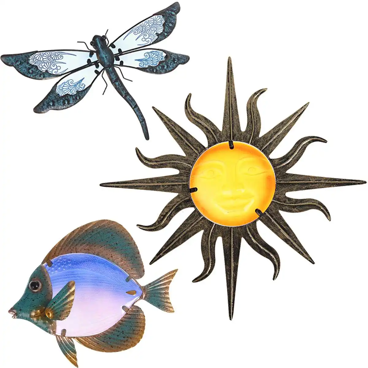 Металлическая стрекозарыбасолнце-смайлик, настенное искусство для украшения сада, миниатюры, статуи животных, скульптуры для двора, Декор
