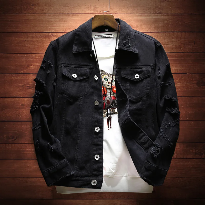 Джинсовая куртка-бомбер мужская, тонкая рваная джинсовая куртка в к...