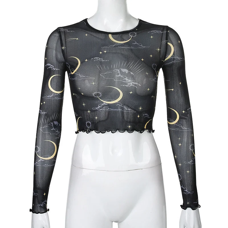 Женский сетчатый Топ Harajuku с длинным рукавом, винтажная Прозрачн...