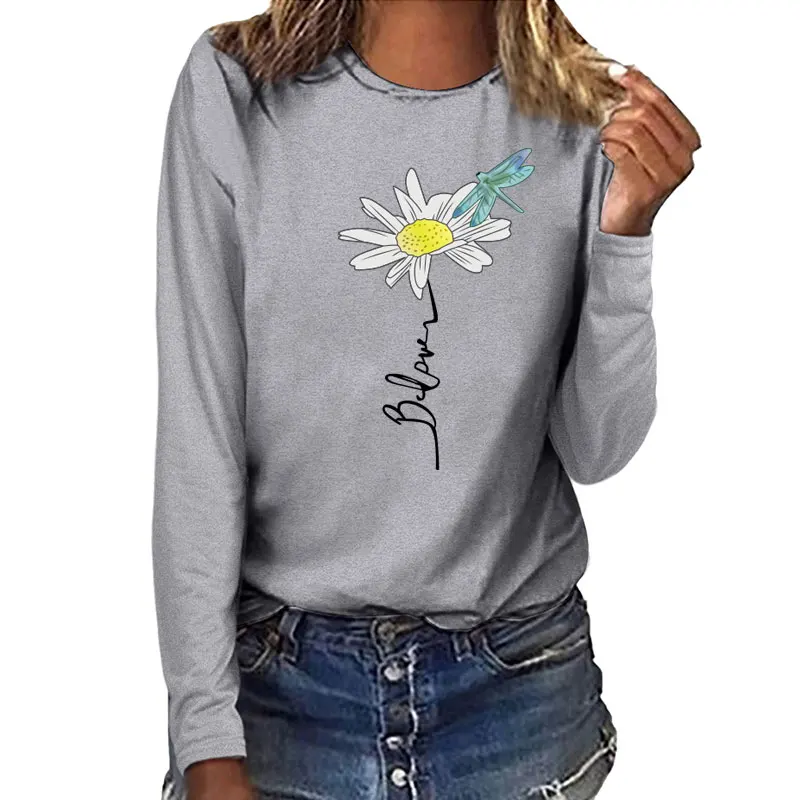 Женская футболка с длинным рукавом, круглым вырезом и принтом в виде цветка стрекозы