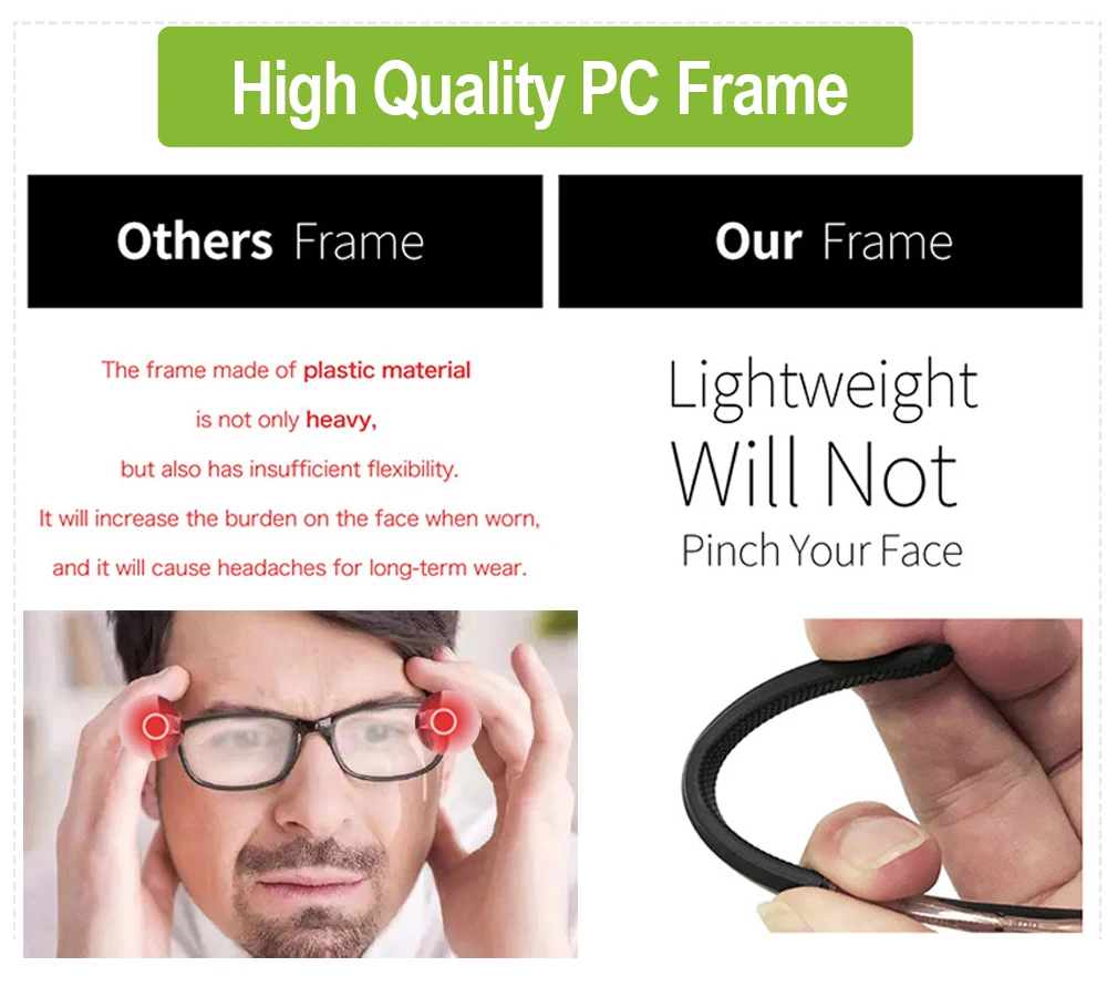 Другая дешевая пластиковая рамка из пластикового материала не только тяжелая, но и имеет недостаточную гибкость. Это увеличит нагрузку на лицо при ношении. И это вызовет головную боль для длительного ношения.