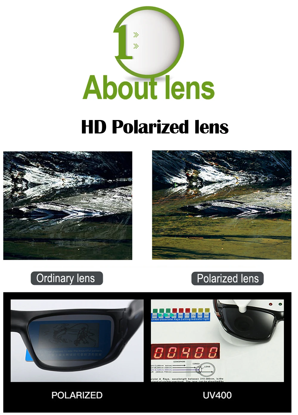 TAC поляризованные линзы-100% защита UV400 покрытие, Блокирует 100% вредных UVA и UVB лучей. Восстанавливает истинный цвет, устраняет отраженный светильник, рассеянный светильник, отлично защищает глаза. Объектив TAC включает 7 слоев. Первый слой-поляризационный слой. 2-й и 3-й слои имеют склеенные слои для обеспечения долговечности. 4-й и 5-й слои являются слоями защиты от УФ, чтобы поглощать уф-светильник. 6 и 7 слоев являются Небьющимися слоями.