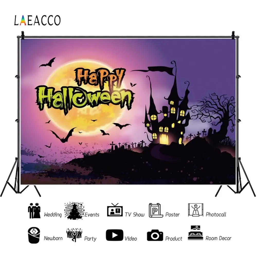Laeacco Счастливый Хэллоуин Фотофон фотозона фотосессия замок дерево летучая мышь кладбище надгробие фотография фон Фото фоны
