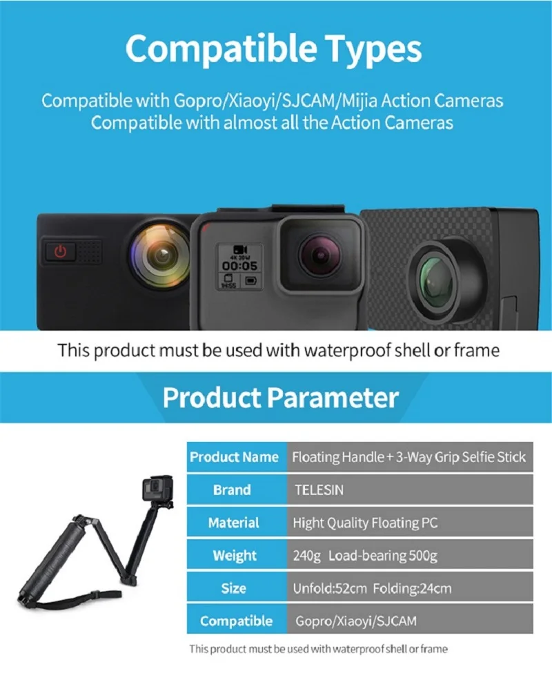 1.Multfunction: плавающая рукоятка или в качестве 3-сторонний выход телескопический шест. Фиксировать и система складывания позволяет регулировать длину полюса в любом месте между 7,9 "и 20,5". 2. Плавает в воде: Когда вы уроните этот плавающий ручной захват/полюс в воду, он будет плавать. 3. Хранение: колпачок в нижней части плавающей рукоятки можно отвинтить, чтобы открыть полое отделение, которое можно использовать для добавления воды (для достижения нейтральной плавучести под водой) или хранения мелких предметов. 4. Безопасность: усовершенствованная ручка TELESIN (нескользящая плавающая ручка) Предотвращает падение селфи-палки и камеры/мобильного телефона и обеспечивает большую стабильность, чтобы убедиться, что вы фотографируете без беспокойства. 5. Помимо прочего Особенности б/у с 3-сторонней Крепление для штатива монопода. Вы можете использовать плавающая ручка удерживает/палка для селфи, как 3-сторонний выход монопод на стол/пол, расширяет возможности использования таким образом, и в то же время Освободите свои руки. 6.Mult-anglle: вращение на 180 ° помогает запечатлеть каждый прекрасный момент.