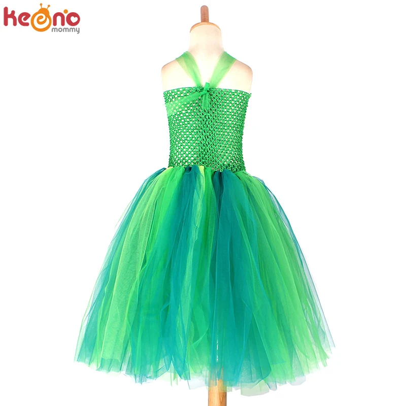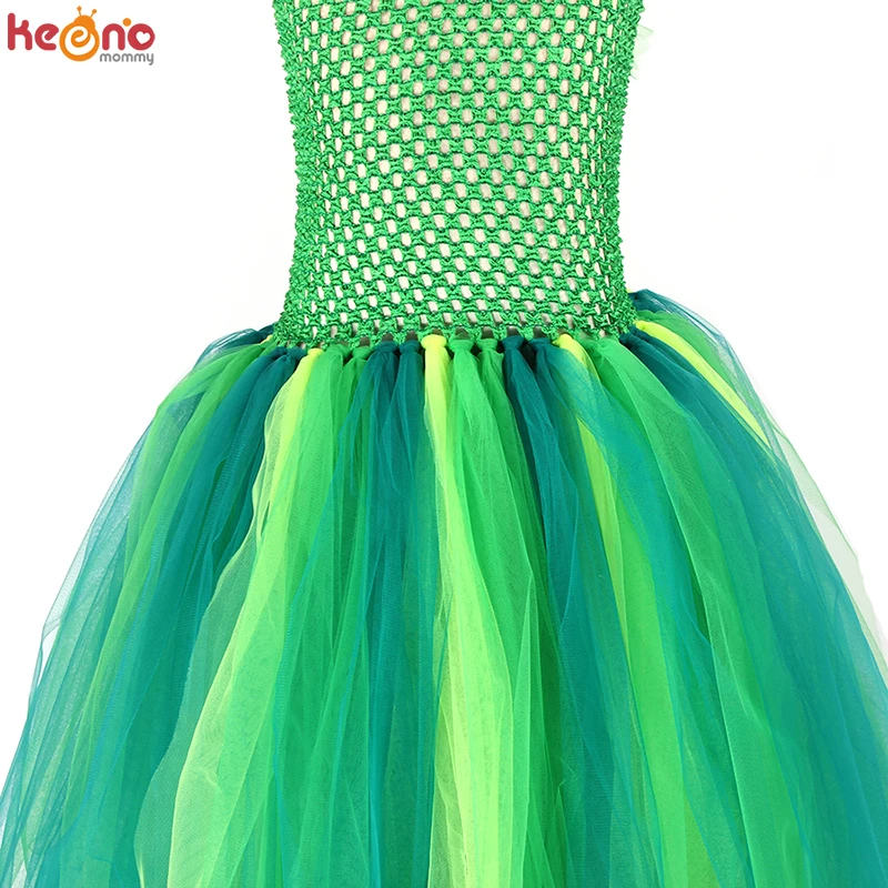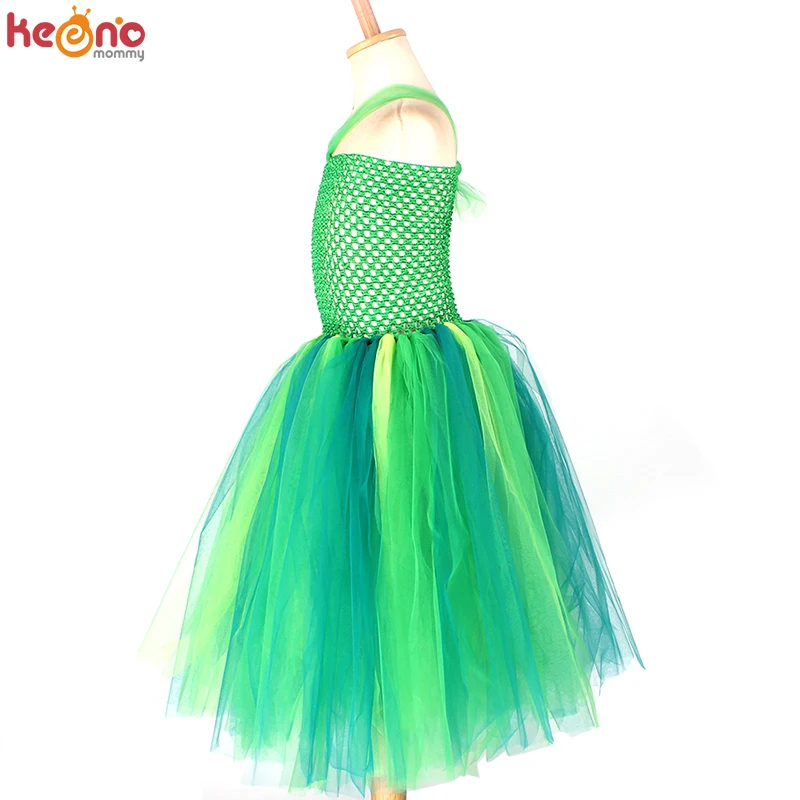 2. Платье-пачка изготовлено из зеленого вязаного топа без подкладки с 3 зелеными нейлоновыми тюлями змеиной расцветки, которые завязываются вручную на лиф.