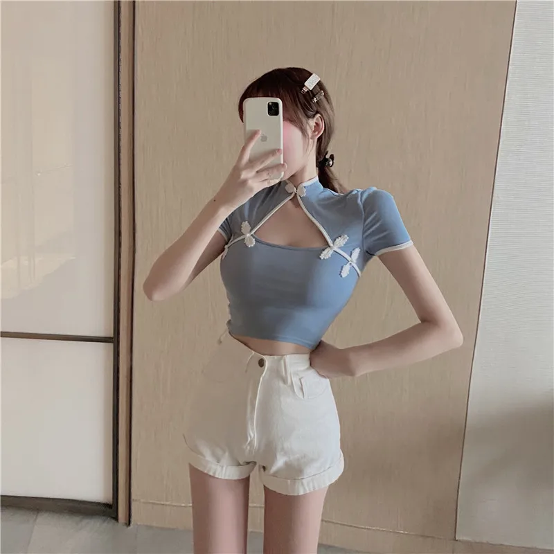 Сексуальный костюм для косплея для девочек, футболка в китайском стиле, укороченный топ, цветная футболка с коротким рукавом, модная футболка Ципао