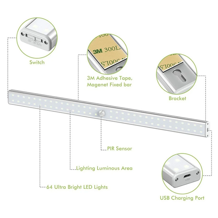 203664 светодиода, датчик движения, светильник для шкафа с зарядкой от USB, подсветка для шкафа, светильник для гардероба, ночная лампа для кухни, спальни