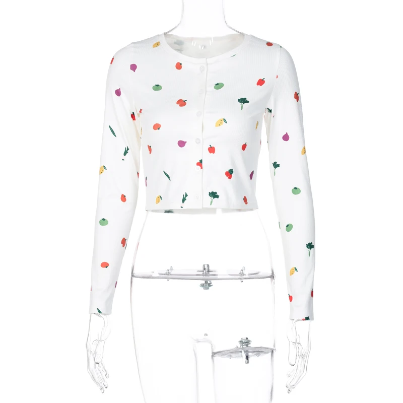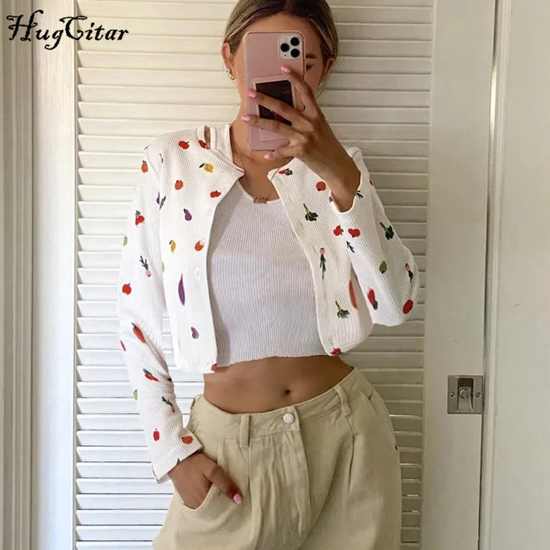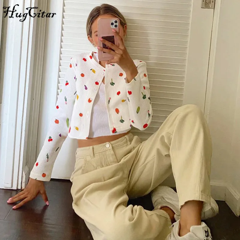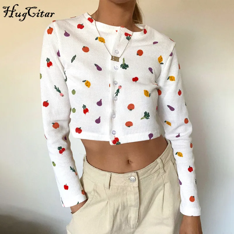 Hugcitar 2020 Кардиган с длинным рукавом и принтом, сексуальный укороченный топ на осень и зиму, женская модная уличная одежда, футболки