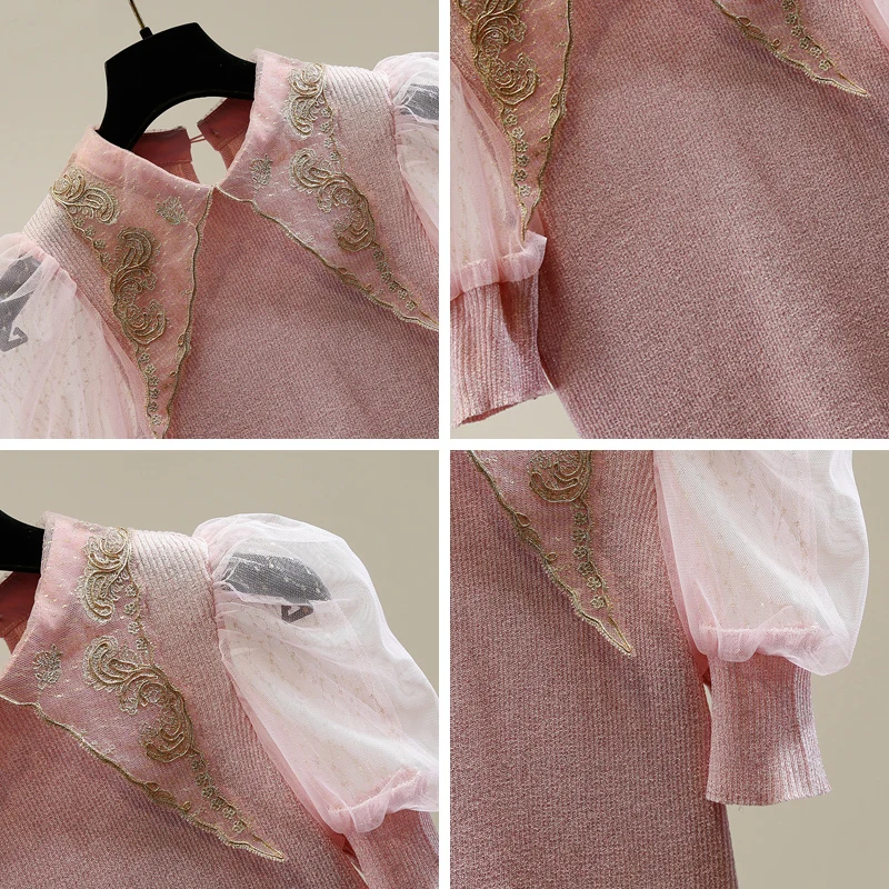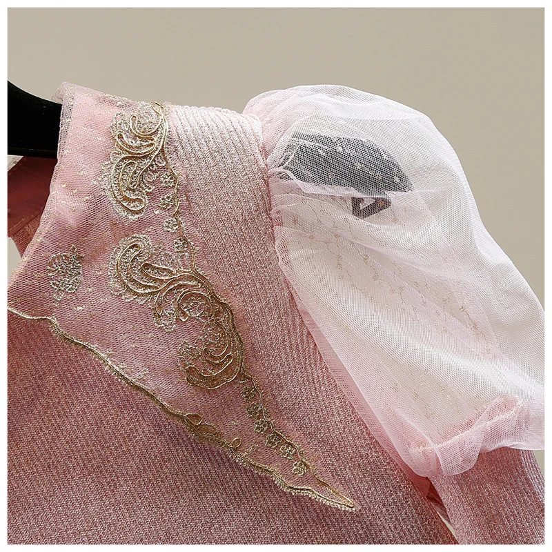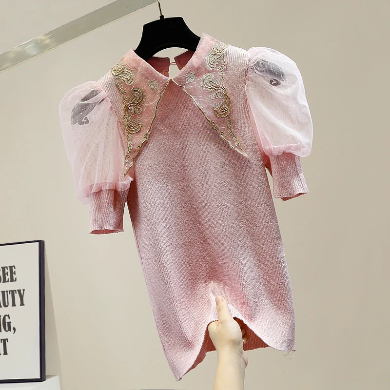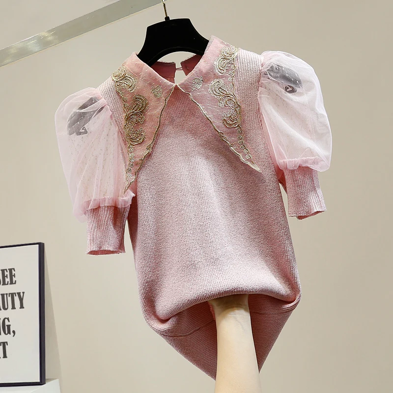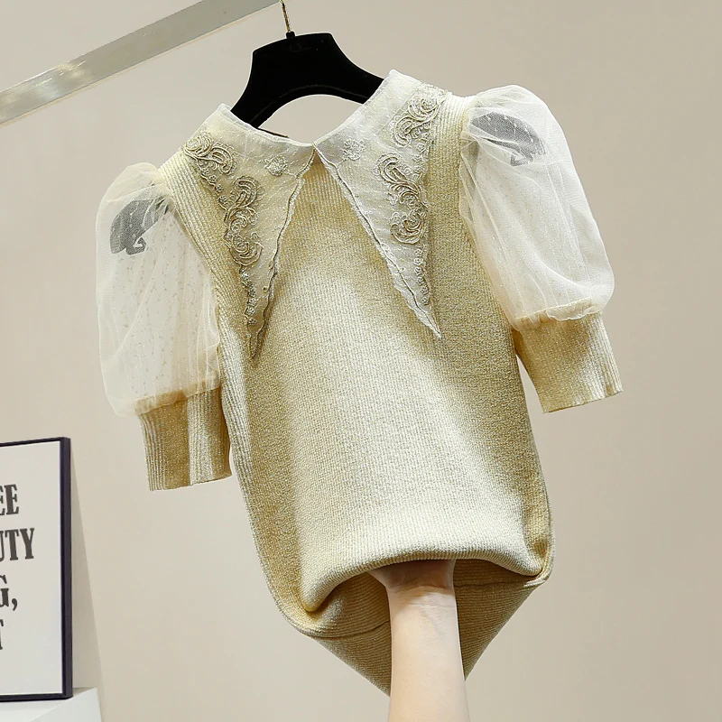 Женская Винтажная футболка с вышивкой, ярко-шелковая вязаная облегающая футболка с сетчатыми рукавами-фонариками и блестками, стрейчевая трикотажная футболка