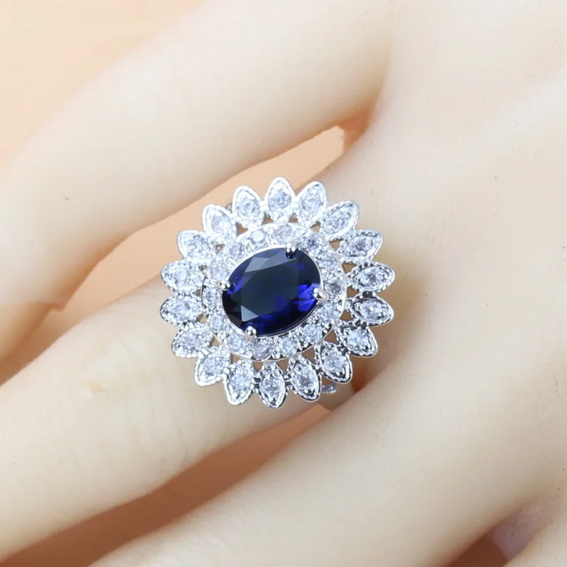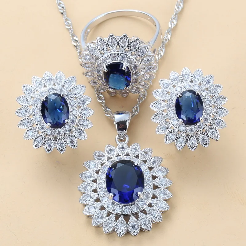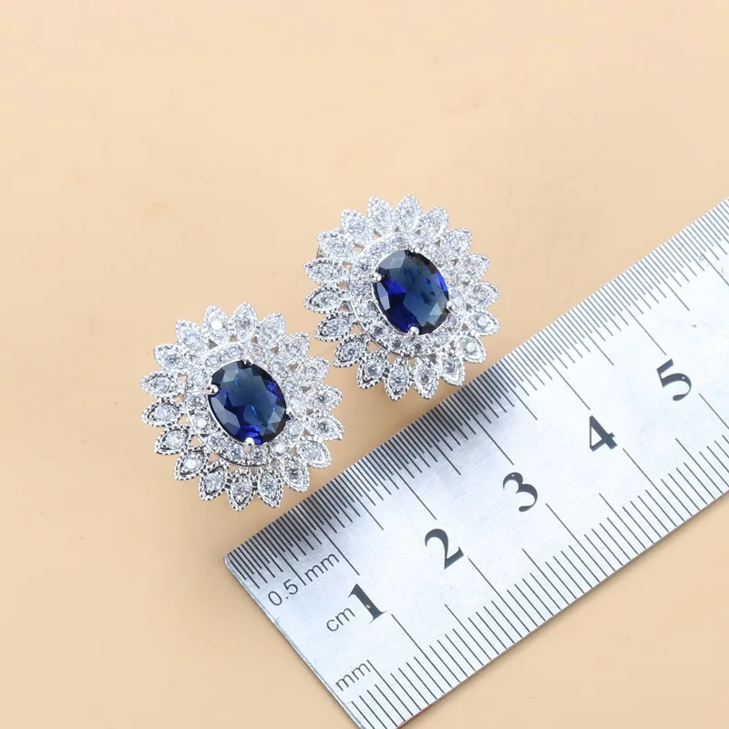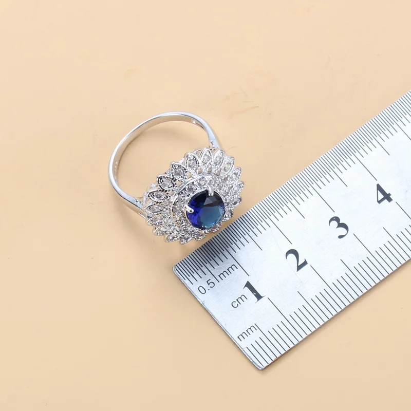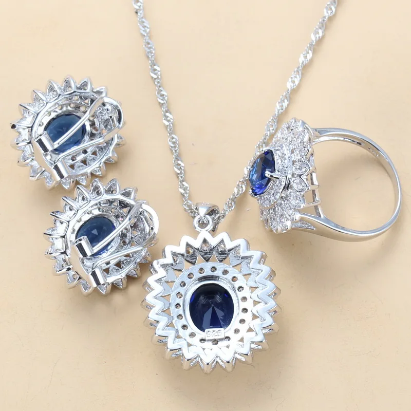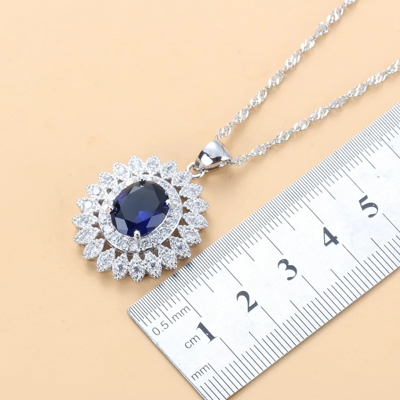 Свадебные серебряные 925 Свадебные аксессуары женские синие кубические циркониевые серьги с подсолнухом и ожерелье кольцо наборы из 3 предметов