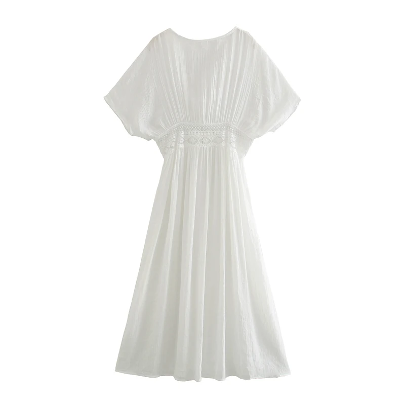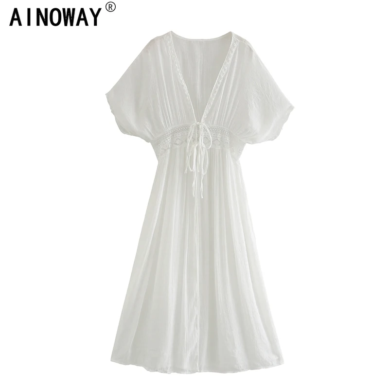 Винтажное шикарное женское белое кружевное пляжное богемное Макси-Платье с заплатками и глубоким V-образным вырезом с высокой эластичной талией, платье в стиле бохо, платья