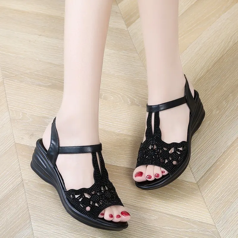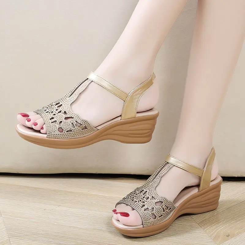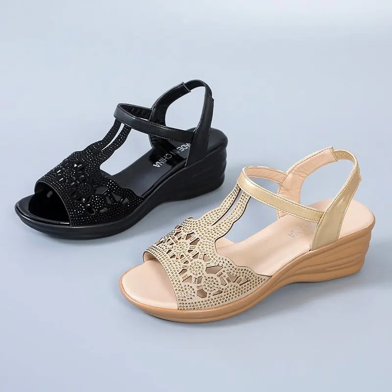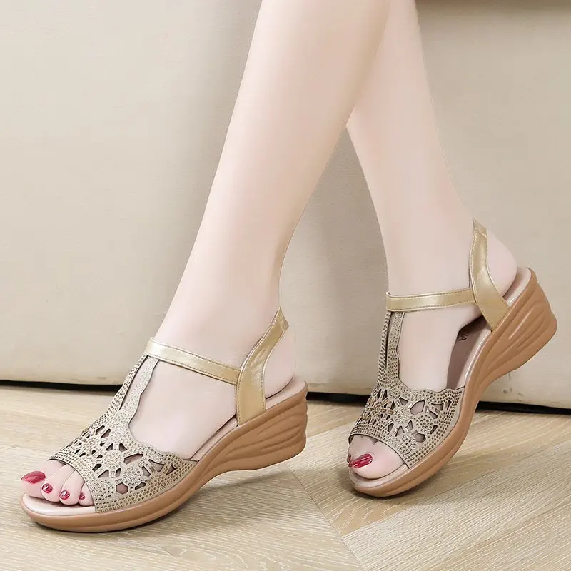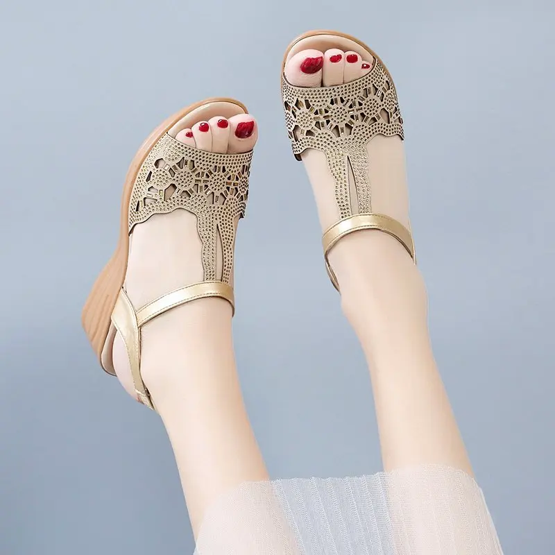 Женские сандалии 2020 г. Летняя обувь женские сандалии на танкетке с Т-образным ремешком блестящие сандалии mujer модельные туфли с вырезами женские золотистые черные 8283N