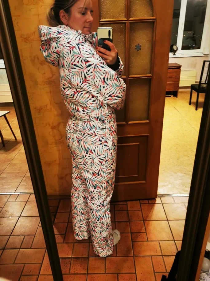 из минусов: торчат нитки, на рукавах большие пальцы жмут, длинные штанины быстро протираются внизу. Но зато достаточно теплый и легкий, не сковывает движение при каталке, правда брала хl на 46+. Под него одеваю только термушку в -13 не замерзла. Есть бомбалюк и проветривалки. Удобные карманы и капюшон