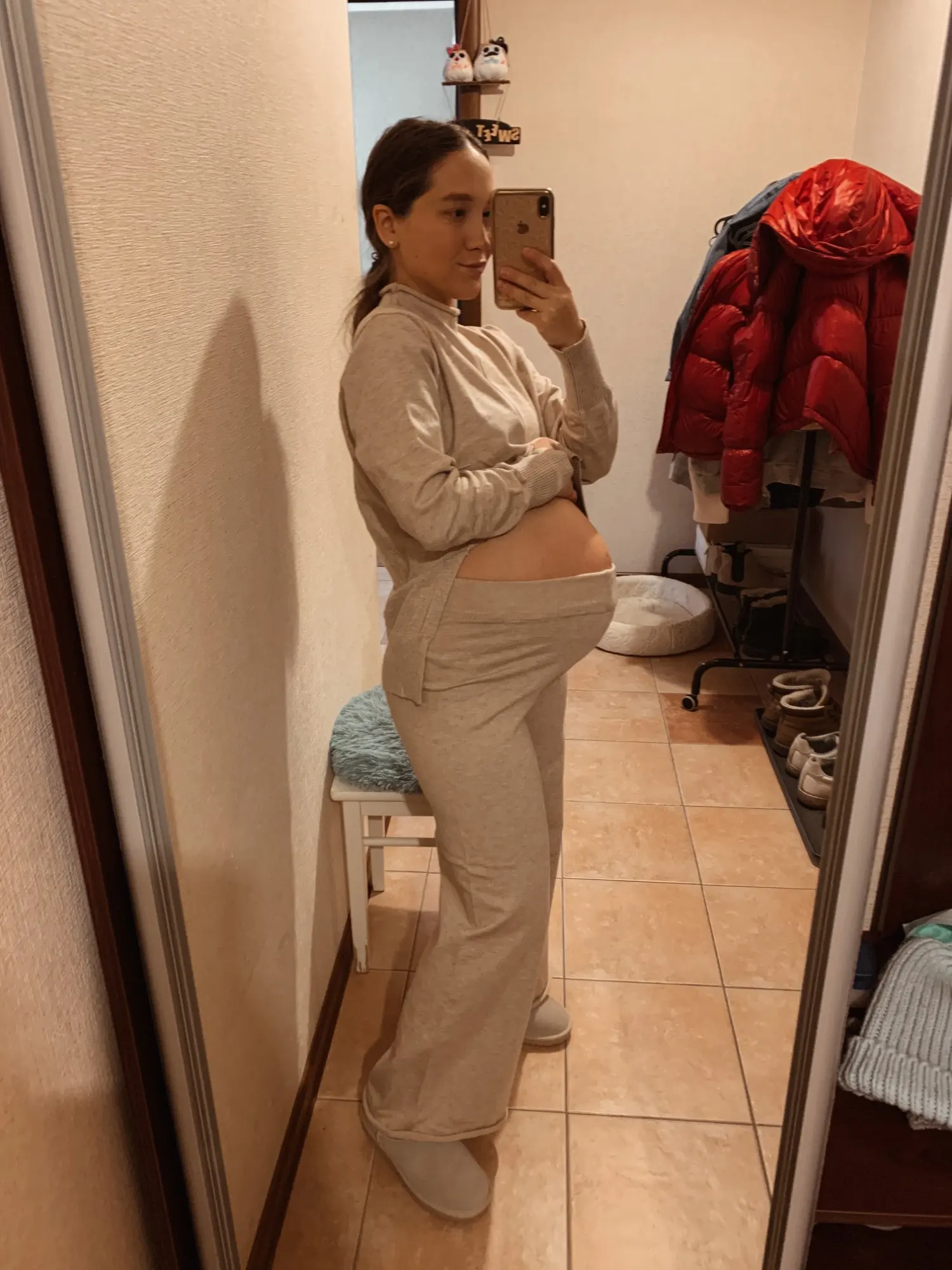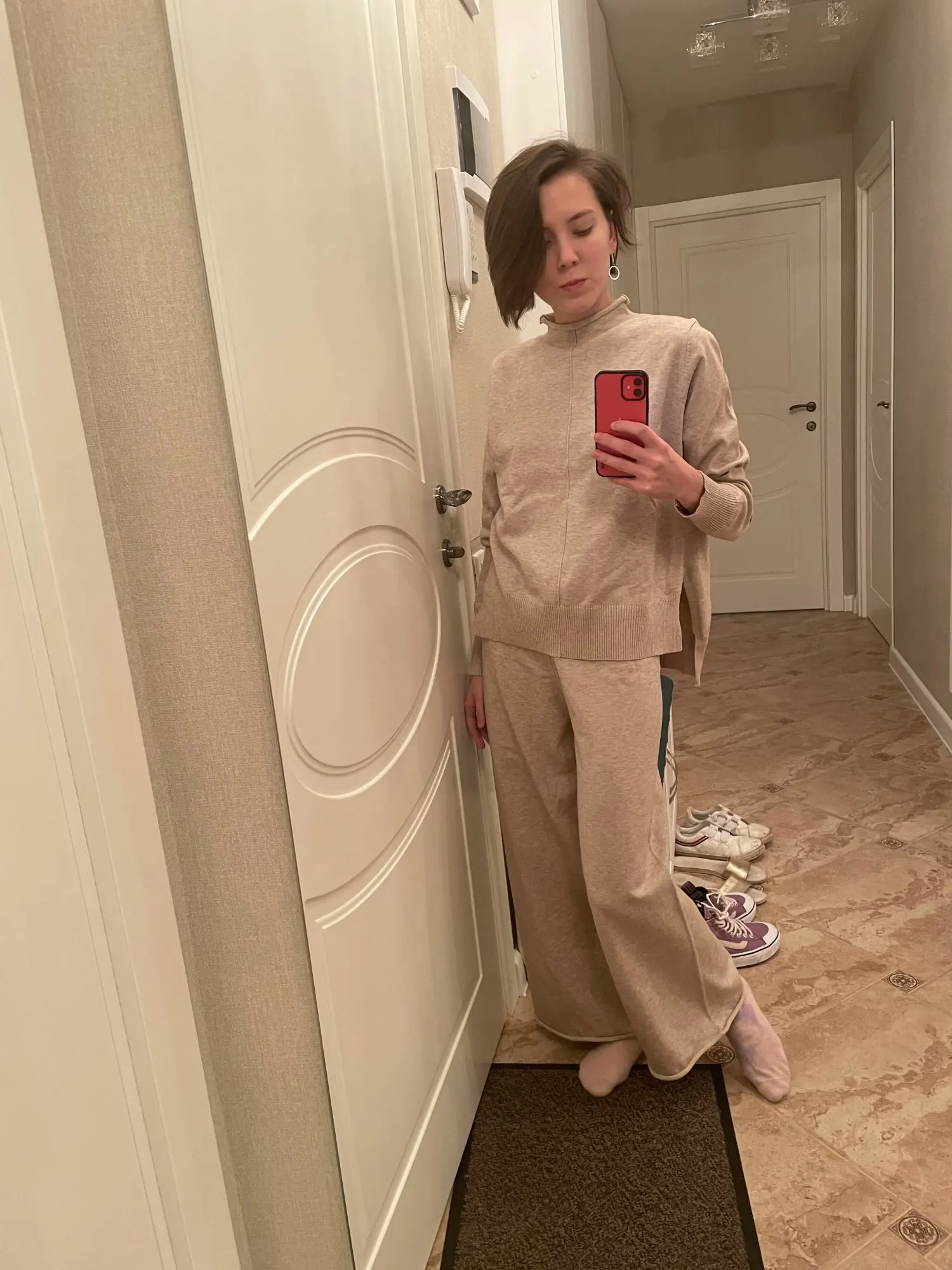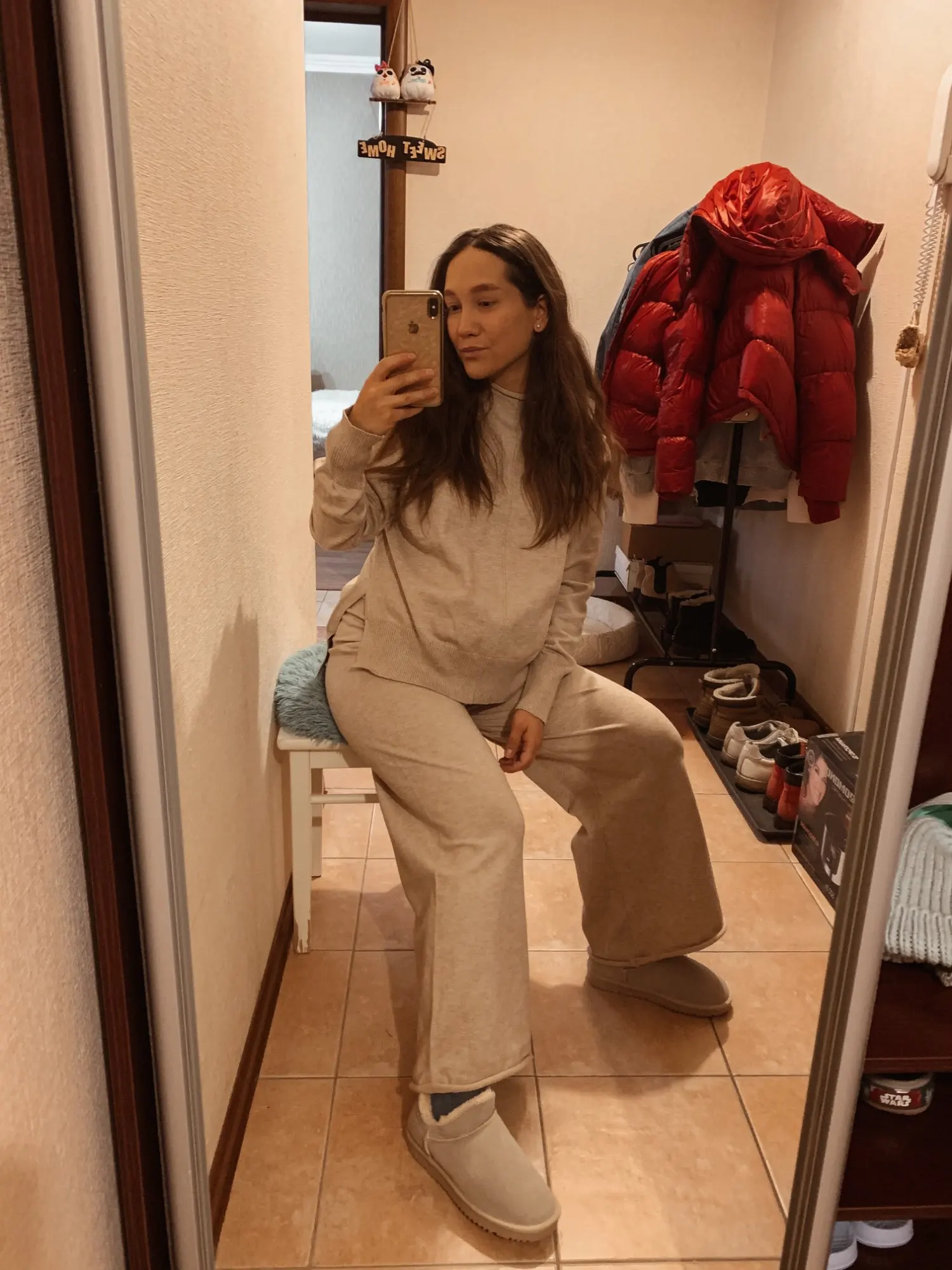 Заказ шёл около 10 дней, забирала в ближайшей «пятёрочке». Очень довольна качеством костюма — он действительно тёплый, приятный на ощупь, уютный, выполнен из плотной ткани. Брала костюм для выписки из роддома, специально взяла размер М, чтобы после родов сидел как оверсайз, хотя и сейчас он хорошо сидит, Единственное только, что живот натягивает свитер, хотя все прикрывает (8 месяц беременности). Мой рост 153 см, вес в беременность 55-56