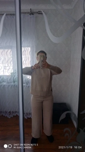Костюм отличный! Тёплый, мягкий, приятный на ощупь. На фото он уже после стирки, не сел, катышков не появилось (стирала жидким средством для шерсти). Размер L на параметры 100/70/100 и рост 168 сел отлично. Свитер свободный. Штаны по длине как раз, на рост выше уже будут коротковаты. До Москвы дошёл за 3 недели.