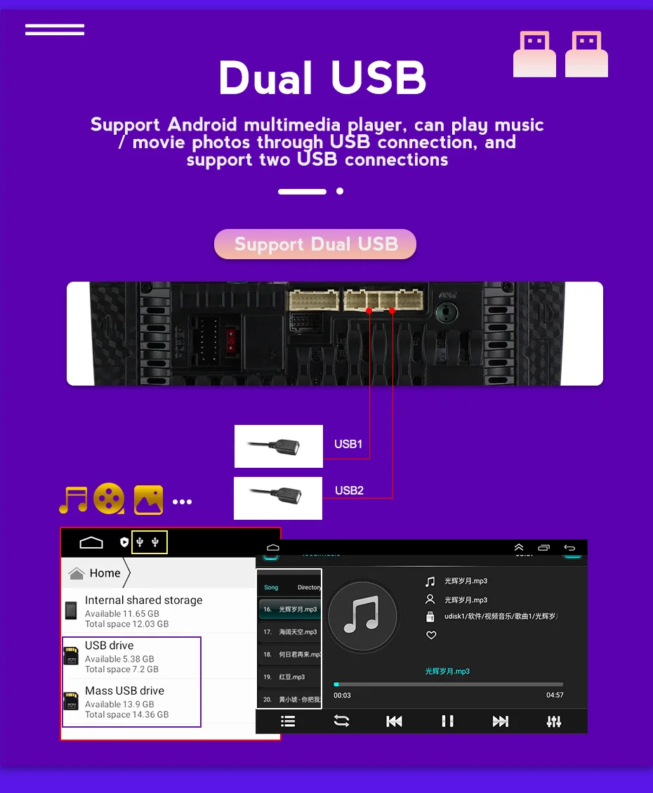 Поддержка 2 usb-порта, воспроизведение видео в формате HD 1080P, зеркальное соединение,Сплит-экран, управление рулевым колесом, Поддержка google play, поддержка цветной кнопочный светильник