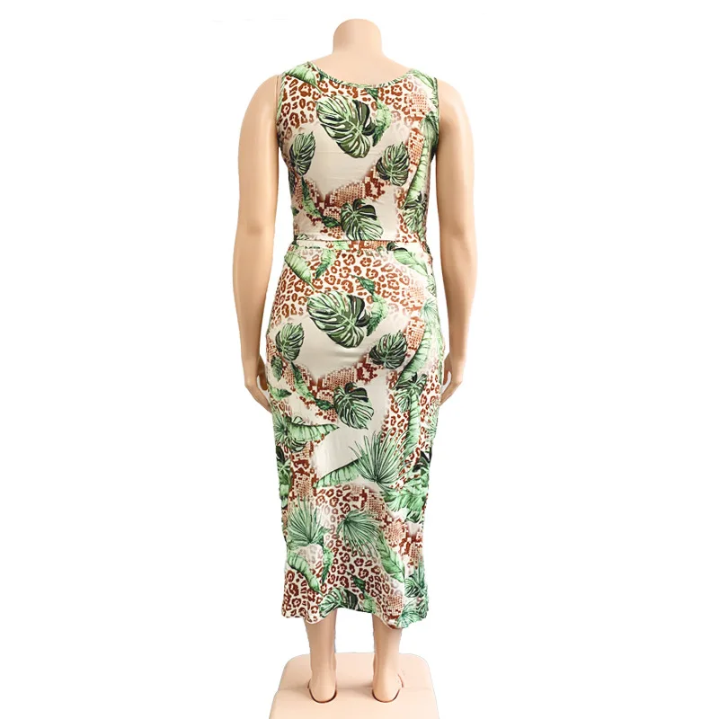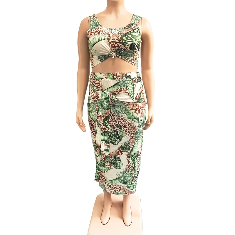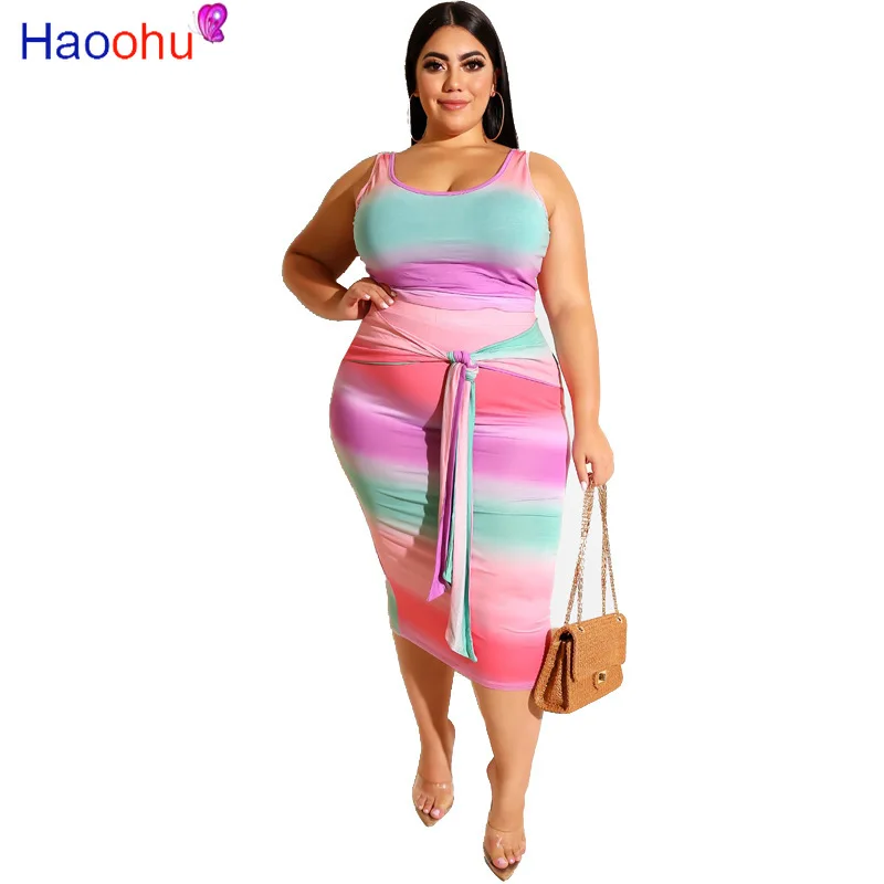 HAOOHU летний женский комплект из двух предметов размера плюс, без бретелек, без рукавов, жилет с карандашом, юбка до середины икры, повседневные Костюмы с принтом