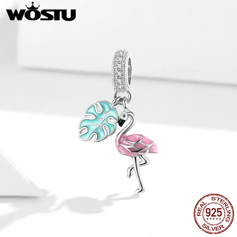 WOSTU 925 пробы, серебряные бусины, тропические фламинго, бусины, цветные, эмалевые, подходят для серебряных браслетов, ювелирных изделий, FNC277