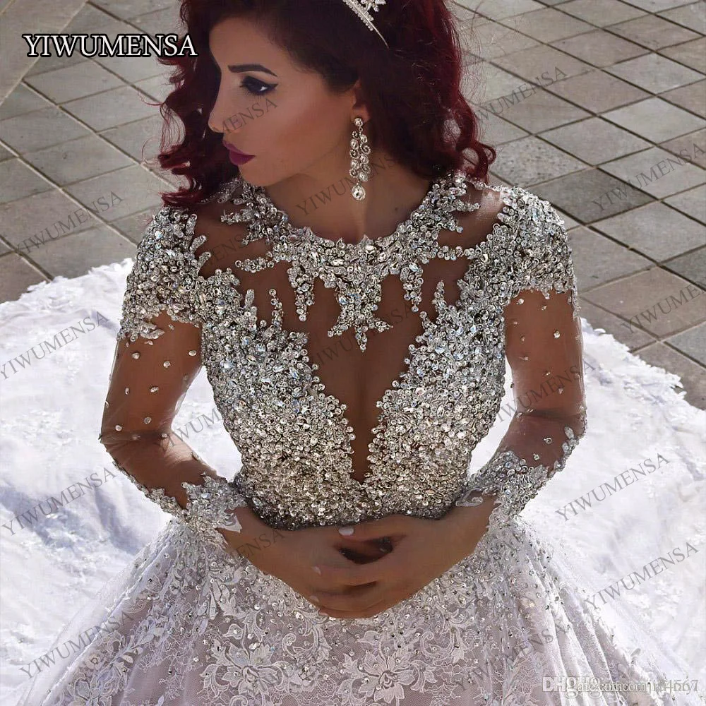 YIWUMENSA сексуальное бальное платье с кристаллами, свадебное платье, Роскошные платья невесты с длинным рукавом, иллюзионные фатиновые платья на спине