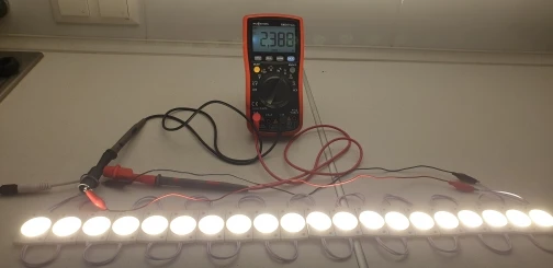Тёплый белый смотрится очень приятно. 20 модулей по 2,4W как на них написано должно выйти 48W, что по идее должно потребовать 4A. Запитал блоком 12v 5A, но даже 3A не просит. При включении было вообще 2A, но через пол часа вышло на максимум 2,39A.