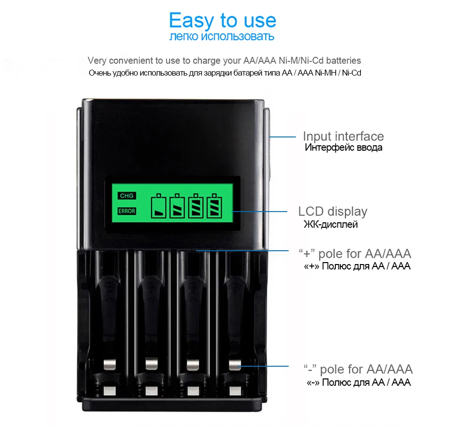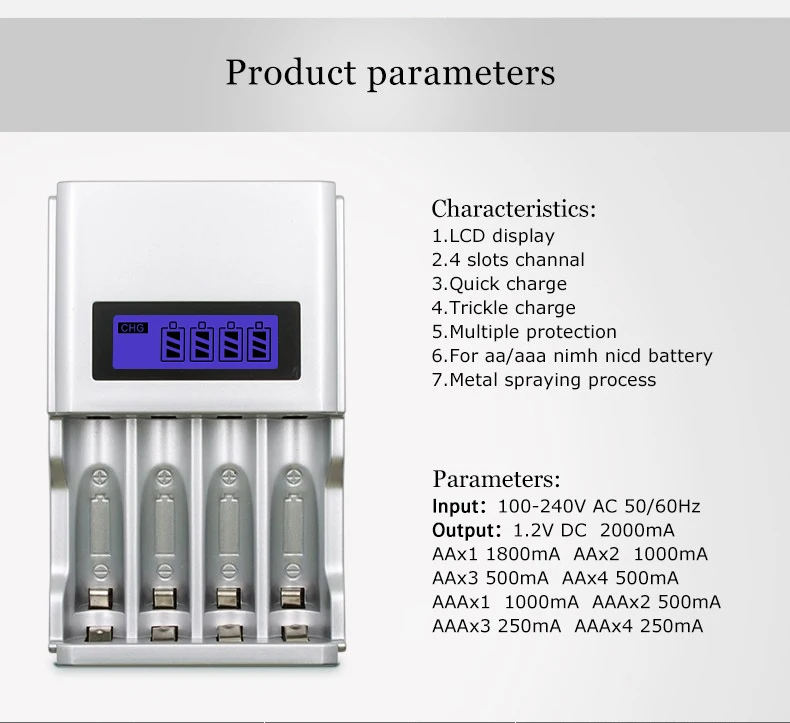 Вход: 100-240 В переменного тока, 50/60 ГцВыход: 1,2 в, DC 1800mA,AA: 1800mAX1 900mAX2 450mAX3 450mAX4AAA: 900mAX1 450mAX2 225mAX3 225mAX41,903 зарядное устройство, без крышки, хорошая теплоотдача, в этот чехол Зарядное устройство заряжает аккумулятор, это не повредит зарядное устройство и аккумулятор2. ЖК-дисплей, ЖК-экран зарядного устройства будет отображать процесс зарядки аккумулятора3. Он может поддерживать нечетное Количество аккумуляторов и даже количество аккумуляторов, таких как 1 единица батареи AA, 3 единицы батарей AA, 4 батарейки AAA4. Переменный ток 100-240 В широкое напряжение, по всему миру, в любой стране5. Для 1,2 V AA, AAA, никель-металл-гидридными и никель-кадмиевыми типами аккумуляторные батареи6. Режим быстрой зарядки: поддержка быстрой зарядки аккумулятора7. После полной зарядки аккумулятора Колонка зарядки будет в состоянии покоя, и питание выключено8. Посылка содержит: зарядное устройство и руководство